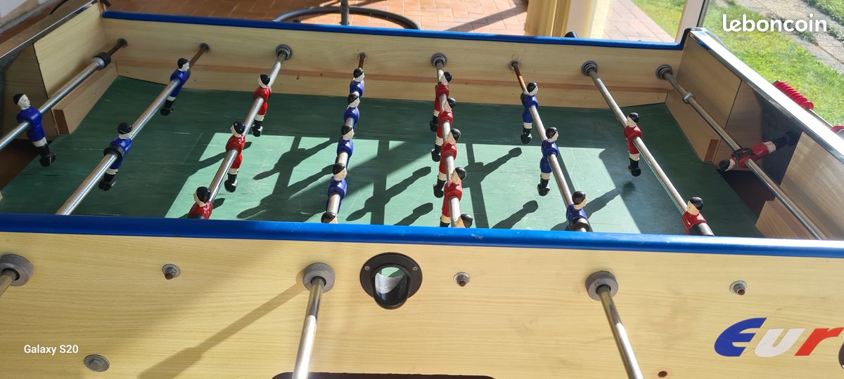 René Pierre Black Match Table Football Timeless & Bold Design Le baby-foot Color est totalement prémonté, soigneusement emballé en carton. Baby Foot Rene Pierre Baby-Foot - Collection Color Bleu RENE PIERRE Baby-foot Français Prémonté En effet, si le design a évolué, les composantes du vrai baby-foot de la Maison RENE PIERRE restent identiques depuis plus de 70 ans pour que ce jeu conserve toutes ses qualités, notamment l’exceptionnel jeu de barres télescopique de la Maison RENE PIERRE avec ses joueurs en métal vissés, sa surface de jeu en gerflex, son retour de balle central et la robustesse du meuble qui lui confère une stabilité optimum. Le baby-foot Color Bleu Marine a été testé et approuvé par les célèbres joueurs de Rugby Sébastien Chabal, Lionel Nallet, Baptiste Couilloud et Ethan Dumortier Baby-foot compact avec renforts en métal assurant une très grande stabilité. Meuble en panneau mélaminé, décor bleu marine. Barres télescopiques haute... Travail à effectuer : assemblage des pieds et des poignées, mise en place des compteurs. 10 minutes de montage suffisent pour fixer les 4 pieds. Notice de montage fournie., Livré avec 2 balles Le COLOR saura donc parfaitement trouver sa place dans votre salon ou votre pièce à vivre. Assemblage simple et rapide : en 10 minutes à deux. Depuis 1952, la maison française RENE PIERRE conçoit des baby-foot alliant qualité de jeu, robustesse et facilité d’entretien.