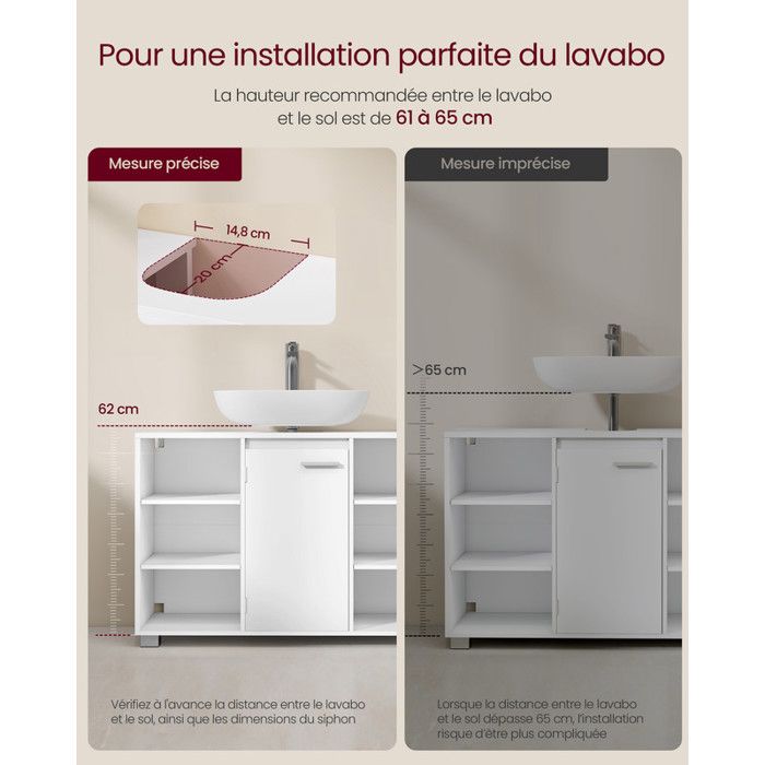 Fera de votre salle de bain bien organisée en optant pour ce meuble sous évier salle de bain Les glissières en métal vous permettent d'ouvrir et de fermer soyeusement le tiroir pour un accès facile des articles rangés Meuble Sous Lavabo Avec Colonne VASAGLE Meuble Bas De Salle De Bain, Avec 3 Tiroirs, Étagères Réglables Meuble Colonne Vous pouvez fixer ce meuble salle de bain sous lavabo au mur avec le kit anti-basculement pour plus de sécurité et de stabilité. Meuble Sous Lavabo Colonne sur VASAGLE Meuble bas de Salle de Bain, avec 3 Tiroirs, Étagères Réglables... Veuillez mesurer la taille de votre siphon et l'espace disponible sous l'évier avant l'achat. Pieds du Meuble Métalliques : Les 4 pieds en métal de 5 cm conféreront à cette colonne de rangement blanche un aspect moderne et esthétique, épargnant les objets placés à l'écart de l'humidité et facilitant votre nettoyage. L'espace réservé au tuyau d'évier offrira une solution de rangement optimal pour votre salle de main et facilitera l'entretien. Costaud et Pratique : Fabriqué en panneaux de particules bien laqués et en charnières métalliques de qualité supérieure, ce meuble sous vasque sera imperméable, durable, résistant à l'humidité et facile à nettoyer. Grâce à ses lignes épurées et couleur blanche élégante, ce meuble salle de bain avec vasque s'intégrera parfaitement dans tous styles de salle de bain, tout en ajoutant une touche de sophistication et de style Poignée Profil Ergonomique et minimaliste, facilitant l'ouverture et la fermeture des portes et tiroirs