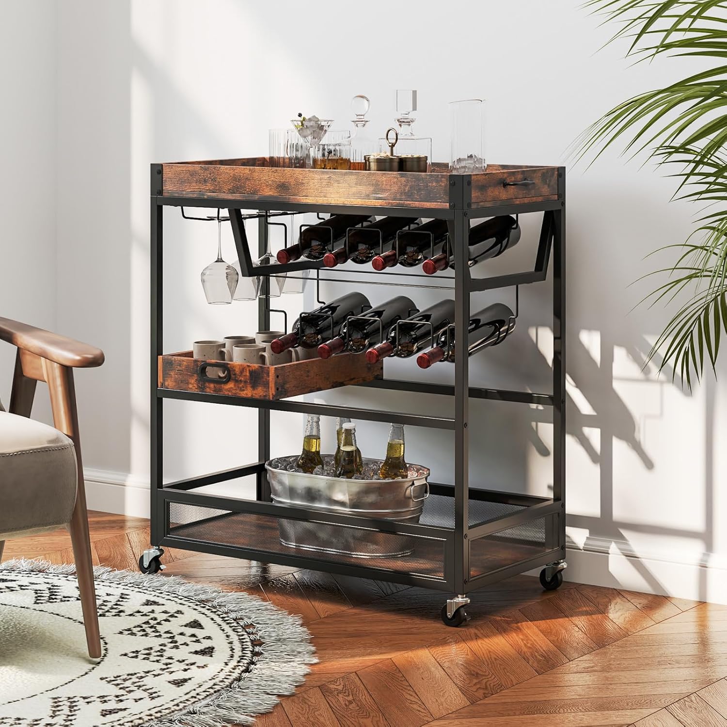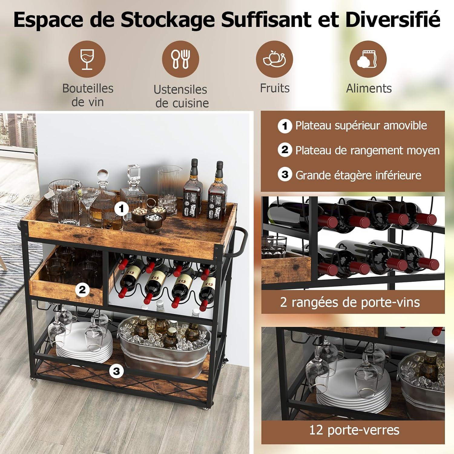 Giantex Chariot De Service De Bar à Domicile, Chariot à Barre Roulante à 3 Niveaux Avec Plateau Amovible, Casier à Vin Et Support Pour Verre, Chariot à Vin... Structure Robuste et Fiable - Fabriqué à partir de MDF robuste et d'un cadre en métal, ce chariot de service est conçu pour durer et supporte une charge substantielle allant jusqu'à 80 kg afin que vous puissiez le charger en toute confiance avec des boissons, de la vaisselle ou des articles de décoration. Charme Industriel Moderne - Ce chariot utilitaire d'inspiration industrielle s'intègre sans effort dans une gamme de décorations d'intérieur, ce qui en fait un ajout frappant à toute cuisine, salle à manger ou salon, alliant fonctionnalité et style contemporain. Desserte Giantex Darty GIANTEX Chariot De Bar à Roulettes, Desserte De Cuisine 3 Niveaux Avec Bar Mobile Il comprend également des porte-verres à double rangée, complétés par 3 étagères pour un rangement supplémentaire. Dimensions du produit. 40P x 84l x 90H centimètres · Type d'étagère. Étagères ouvertes et porte-bouteilles pour vin · Matériau. Bois d'ingénierie Métal · Matériau... Les bords métalliques ajoutent de la durabilité tandis que les inserts en caoutchouc maintiennent le plateau en place pendant le transport. Desserte Giantex Desserte à roulettes à 3 Niveaux Style