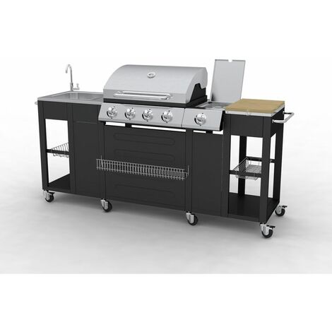 Cuisine d'extérieure 6 modules avec barbecue gaz 4 brûleurs inox noir Thermomètre dans le couvercle Cuisine Jardin Grand Modèle Barbecue Gaz 4+1 Brûleur, Cuisine Extérieure Texas - Happy Garden Cuisine Extérieure Familial Les produit :Cuisine d'extérieure4 feux puissantsSe déplace facilement (Une poignée et 6 roues)Dessertes détachablesCuire vos brochettes avec le barbecue... EN STOCK : Barbecue 4 brûleurs. Cuisine d'extérieure danglars. Acier noir. L 223.5 x p 60.5 x h 142 cm pas cher - Retrait & Livraison - Paiement 4X...