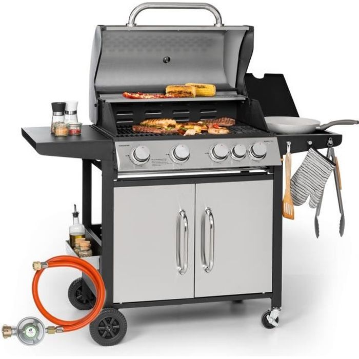 Équipé de commandes qui permettent aux gourmets de réguler la chaleur sans effort et avec précision, il allie harmonieusement efficacité, polyvalence et attrait visuel et transforme l'art de la cuisine en une expérience agréable et intense., Utilisation : Dimensions du colis : 66 x 50,5 x 21,8 cm., Poids brut : 10 kg. Mode d'allumage : allumage manuel Nombre de brûleurs : 5 , Nombre de boutons : 5., Type de combustible : gaz naturel. 1 cuisinière à gaz naturel avec 5 brûleurs. Contenu de la livraison : Bbq Gaz Barbecue à Gaz Autonome Et De Voyage 2 Brûleurs Avec Tablettes Latérales Refermables Sportsman2 Cuisinière Extérieur Brûleurs Indépendants Pack barbecue à gaz 4 brûleurs inox gris avec tournebroche et plancha CHAR-BROIL - Mr Scandinave Dimensions du four : 64 x 44,5 x 16,5 cm., Hauteur totale : 82 cm. et est adapté pour les activités de plein air telles que le camping, la pêche, les voyages en camping-car et la préparation aux situations d'urgence., Caractéristiques : Travail efficace : il dispose de cinq brûleurs qui peuvent être utilisés simultanément. Barbecue Gaz Encastrable Acier Noir Maxim GTI4 - Grandhall Hauteur du pied inférieur : 6,5 cm. Protection bien pensée : le couvercle fourni empêche efficacement le vent et la poussière, créant ainsi un environnement de travail propre et sûr. Tous les accessoires pour l'utilisation. Weber Barbecue au gaz naturel avec brûleurs haute performance GS4... Planche de placement : il est équipé de deux étagères pour poser facilement les ingrédients, les légumes, les épices, la vaisselle, etc., (non inclus). Pieds surélevés : les pieds de 6 cm favorisent la circulation de l'air et réduisent l'érosion directe de l'humidité du sol, ce qui prolonge la durée de vie de la cuisinière à gaz. Distance entre le plateau de placement : 30,5 cm, 25 cm.