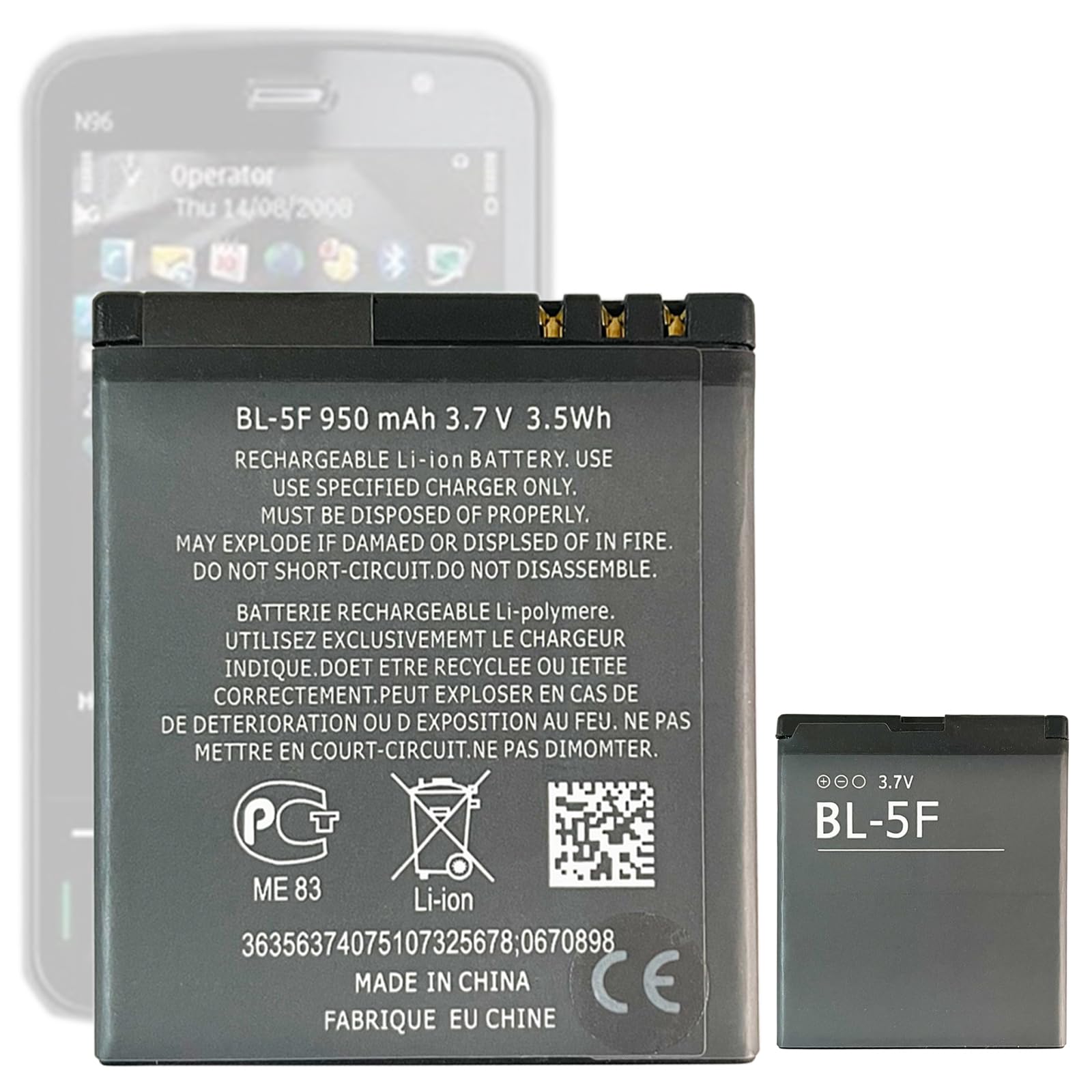 Votre satisfaction est toujours notre objectif. Cette batterie de haute qualité est soumise à un contrôle de qualité strict avant l'expédition et dispose d'une protection contre la surcharge, la décharge excessive et la surchauffe, de sorte que vous n'avez pas à vous soucier de la qualité. Batterie Polymère 3.7V Téléphone Ancien Batterie Compatible Avec Nokia BL-5F BL5F N95 N96 N93 E65 6210 6290 Batterie Nokia E65 6210 6290 6710 Ces chargeurs non officiels peuvent ne pas fournir une sortie de courant et de tension stable, ce qui peut entraîner des risques potentiels pour la sécurité. Nokia - BL-5F - Li-Ion batéria pre N95 - 950 Batterie BL-5F pour Nokia 6290 E65 N93i 6210 N96 6210S 6710N N95 BL 5F · 7,6€. 105 vendus 4.7. Batterie BL-5F 950mAh BL 5F pour Batteries Nokia E65 N93i N95 N96... Après avoir déchargé, connectez la batterie à un chargeur approprié et attendez patiemment que le niveau de batterie affiche 100 %. En outre, vous n'avez plus besoin de charger votre appareil avec cette batterie aussi souvent qu'auparavant, ce qui vous donne plus de sécurité lors de vos déplacements. Ce n'est qu'alors que la batterie déploie ses performances supérieures, prolonge sa durée de vie et vous offre une alimentation en énergie plus longue et plus stable. Compatible avec : Nokia N95 N96 N93 E65 6210 6290 6710., Remarque avant l'achat., 1., Avant d'acheter cette batterie, veuillez vérifier soigneusement votre modèle d'appareil pour vérifier si cette batterie est compatible., 2., Les nouvelles batteries lithium-ion nécessitent 2 ou 3 cycles complets de charge/décharge, tandis que les réactions chimiques à l'intérieur de la batterie se stabilisent progressivement et la compatibilité de l'interface entre les matériaux d'électrode et l'électrolyte est optimisée pour une performance optimale de la batterie., 3., Vous pouvez demander à un professionnel d'installer la nouvelle batterie pour vous, ou vous pouvez vérifier les informations en ligne ou la vidéo pour l'installer vous-même, vous pouvez vérifier la vidéo d'installation correspondante sur Youtube, veuillez vous assurer que la prise a été correctement connectée à votre appareil pendant l'installation., 4., Assurer la santé et la sécurité de votre appareil et de la batterie, n'oubliez pas d'utiliser des adaptateurs tiers non certifiés ou qualifiés pour charger votre appareil. Lorsque vous utilisez votre appareil pour la première fois, la batterie se décharge jusqu'à ce que l'appareil s'éteint automatiquement, c'est-à-dire jusqu'à ce qu'il soit complètement déchargé. Informations sur l'article : Numéro d'article : BL-5F., Capacité : 950 mAh., Tension : 3,7., Type : polymère., Contenu : 1 batterie, 1 outil.