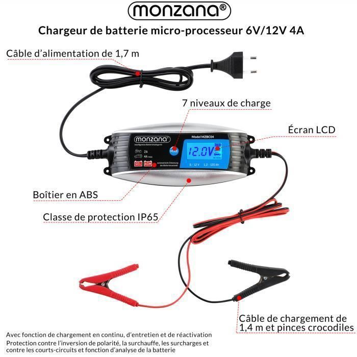 12V 6A impulsion Réparation LCD Chargeur de batterie Plomb-acide Pr Voitures Chargeur De Batterie De Voiture 12V 6A Batterie Au Lithium Acide De Chargeur Batterie Application polyvalente]Le chargeur EYPINS convient à tous les types de batteries au plomb-acide de 6 V, 8 V, 12 V, 14 V, 16 V et 24 V, y compris les batteries en gel, AGM et STD Charge rapide polyvalente : Ce chargeur de batterie 12 V délivre une charge rapide de 6 A, compatible avec les batteries au plomb-acide 12 V de 4 Ah à 100 Ah. CHARGEUR DE BATTERIE Voiture Moto Automatique 12V 6A Charge Rapide... Affichage intelligent : L'écran LCD affiche en temps réel la tension, le pourcentage de charge et l'état de santé de la batterie, facilitant son entretien sans nécessiter de compétences techniques Sécurité optimisée : Doté de protections contre l'inversion de polarité, les étincelles, la surcharge et la surchauffe, ce chargeur garantit une utilisation sûre et fiable, minimisant les risques liés à une mauvaise manipulation