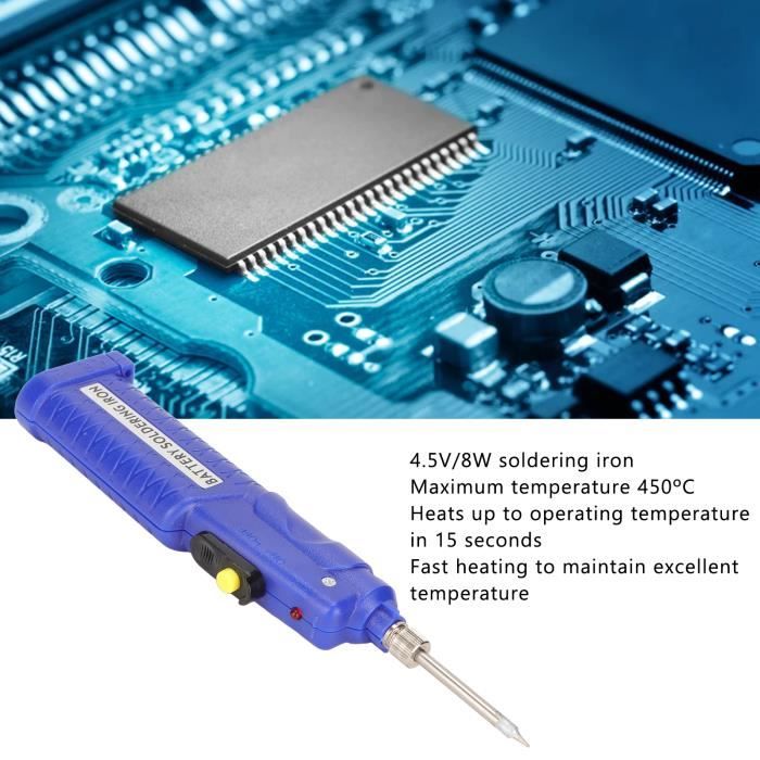 - Longueur de la ligne d'alimentation : environ 150cm - Dimensions : environ 180x38x20mm (y compris l'embout, LxWxD) - Pointe à souder avec capuchon de protection - Livraison avec environ 4g de soudure dans le distributeur - Fonctionnement avec 3x piles AA 1,5V (non incluses) - durée de fonctionnement d'environ 1h (avec des piles neuves) - toutes les données selon le fabricant Fer a souder 200W électrique SAMS - ABL Transfo Durée de fonctionnement : environ 1 heure avec un nouveau jeu de piles. Fer à Souder Batterie à Souder 8W DC 4,5 V Soudure Sans Fil Bricolage ) - Temps de chauffage : - Temps de refroidissement : 30 sec. Piston à batterie avec un temps de chauffe très faible moins de 15 secondes. Weller Fer à souder rechargeable sans fil 12W, alimenté par batterie... Poids : 30 g (sans piles). Tension de fonctionnement : 4,5 V - Puissance : 8 W - Temps de chauffe : < 15 sec., / 30 sec. Le fer à souder léger et performant ZD-708A de Blanko vous permettra d'effectuer vos travaux de soudure de précision, notamment grâce à la température réglable Livré avec pointe longue durée et environ 4 g d'étain dans le distributeur Le capuchon de protection empêche l'allumage accidentel Fonctionne avec 3 piles AA (non incluses). Quand tout doit aller vite - le fer à souder mobile ! Dimensions (L x l x P) : environ 180 pièces avec pointe x 38 x 20 mm.