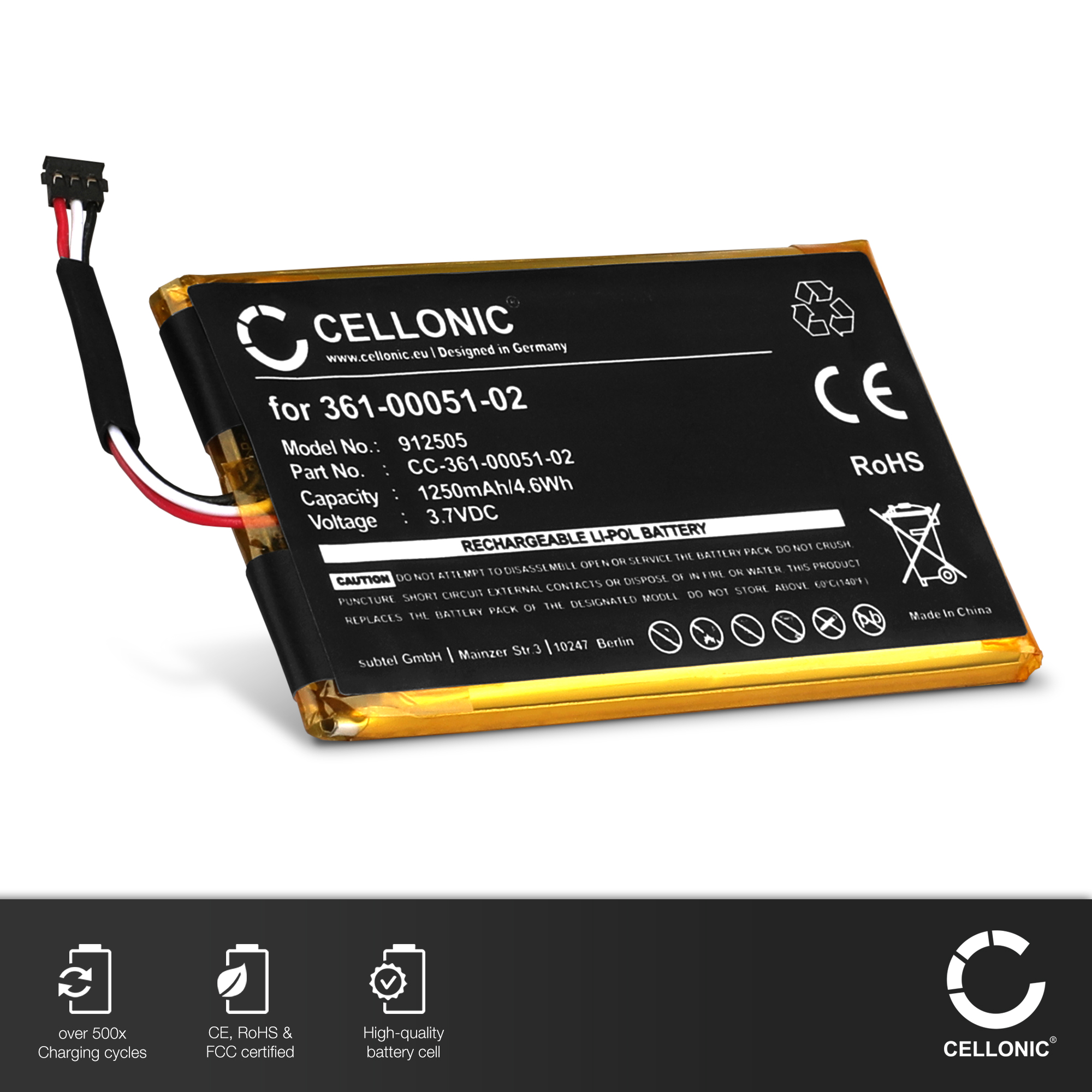 - Batterie de remplacement idéale – Conçue spécifiquement pour correspondre aux performances de la batterie d’origine 361-00051-02, 361-00051-12 et assurer une compatibilité totale. CELLONIC, Batterie Lecteur Code Barres Compatible avec Motorola Symbol Haute capacité – Batterie rechargeable 1250mAh offrant des performances efficaces et fiables. Batterie Polymere Batterie GPS Compatible Avec Garmin Sat NAV Dezl 560LMT Nüvi 2595LMT 1250mAh Batterie Garmin Énergie fiable, performance prolongée- Qualité premium et longue autonomie – Les cellules haute performance Lithium Polymère fournissent une alimentation stable avec moins d’interruptions de charge, garantissant une navigation fluide. - Technologie à faible auto-décharge – Conçue pour prolonger la durée de vie de la batterie tout en garantissant une alimentation fiable et constante. CELLONIC, Batterie GPS Compatible avec Garmin Sat NAV, Dezl 560LMT, nüvi 2595LMT (1250mAh, 3.7V) Batterie de Remplacement 361-00051-02, 361-00051-12 Une alternative économique aux batteries d’origine, offrant des performances optimales sans le prix élevé Ajustement parfait et large compatibilité – Batterie de remplacement compatible avec compatible avec Garmin nüvi 2595LMT, Dezl 560LMT, dezl 560LT, Nüvi 2505., Consultez la description du produit pour la liste complète des modèles compatibles 100% compatible avec votre batterie d'origine Garmin 361-00051-02, 361-00051-12 Données techniques: Marque: CELLONIC Capacité: 1250mAh Tension: 3.6V - 3-7V Type de cellule: Lithium Polymère Dimensions: 60 x 36 x 5mm Couleur: noir blanc Avec CELLONIC - vous avez une batterie pas chère et de grande qualité - Vérifiez la compatibilité avant l’achat – Assurez-vous que votre appareil est compatible afin d’éviter les retours et le gaspillage inutile. - Installation facile et ajustement sécurisé – Conçue pour un remplacement rapide et sans souci, assurant un ajustement parfait pour compatible avec Garmin. Idéal comme batterie de remplacement ou de secours pour une navigation prolongée Votre appareil se décharge rapidement ou s’éteint de manière inattendue ? Restaurez ses performances avec cette batterie de remplacement rechargeable et durable, conçue pour que votre appareil fonctionne comme neuf. Qualité allemande, meilleur rapport qualité-prix – Conçue pour la durabilité et l’efficacité.