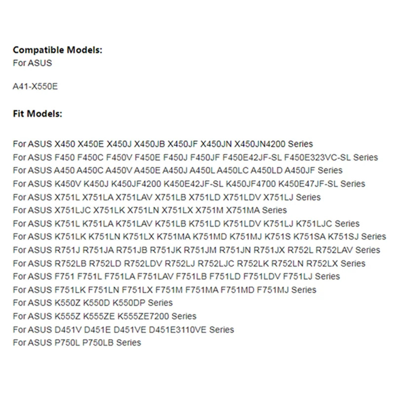 Batterie compatible pour ASUS A41-X550E 14.4V 2600mAh Batterie Pour Asus A41-X550E X751M X751Ma X751L K751L X750Ja 14.4V 2600Mah. EUR 27,99 Achat immédiat. Voir Détails Amazon... Remplacement Batterie Portable Batterie Pour ASUS A41-X550E X751M X751MA X751L K751L Batterie ASUS 14.4V 2600mAh Les meilleures offres pour Batterie compatible pour ASUS A41-X550E 14.4V 2600mAh sont sur Comparez les prix et les spécificités des produits neufs et d'occasion Pleins d'articles en livraison gratuite ✅ Livraison sous 48h, Expédition chaque jour à 15h ✅ Vendue par professionnel - Société Française
