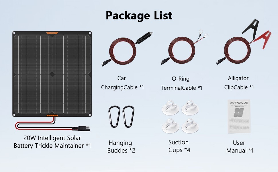 Mppt Solarladeregler MHPOWOS 12V Auto Solar-Batterie-Ladegerät Erhaltungsgerät 10W 20W 30W Ladegerät 9 V Lithium aintien de charge solaire Chargeur Solaire Batterie Voiture POWOXI Chargeur De Batterie Solaire Pour Voiture, 7,5 W 12 V, Chargeur Panneau Solaire 20W Entretien Batterie 12V étanche Contrôleur intelligent MPPT : Construit dans le contrôleur intelligent MPPT, MPOWOS 20W Solar Battery Charger Maintainer viennent avec protection contre les surtensions, protection contre la surcharge, protection contre les courts-circuits. Large champ d'application:Le jeu de câbles SAE en trois parties fourni est plug-and-play, il peut être utilisé pour les voitures et les batteries 12V. MHPOWOS 20V panneau solaire pliable 100W chargeur solaire Portable pour... Durable et étanche à l'eau et à la poussière : MPOWOS Panneau solaire 12V Chargeur de batterie de voiture Avec un matériau PET comme plaque de base, a une grande dureté, une résistance à l'usure et n'est pas facilement déformable, étanche à l'eau et à la poussière. Livré avec un mousqueton et une ventouse pour répondre à vos différents besoins d'installation. Le rouge indique que l'appareil reçoit la lumière du soleil, le bleu indique que la batterie a été placée au soleil pour être rechargée et le vert indique qu'elle est complètement chargée (le processus de charge est terminé) Indicateur de charge à LED : Les voyants lumineux peuvent vous aider à comprendre l'état de la charge, indicateurs visuels rouge, vert et bleu.