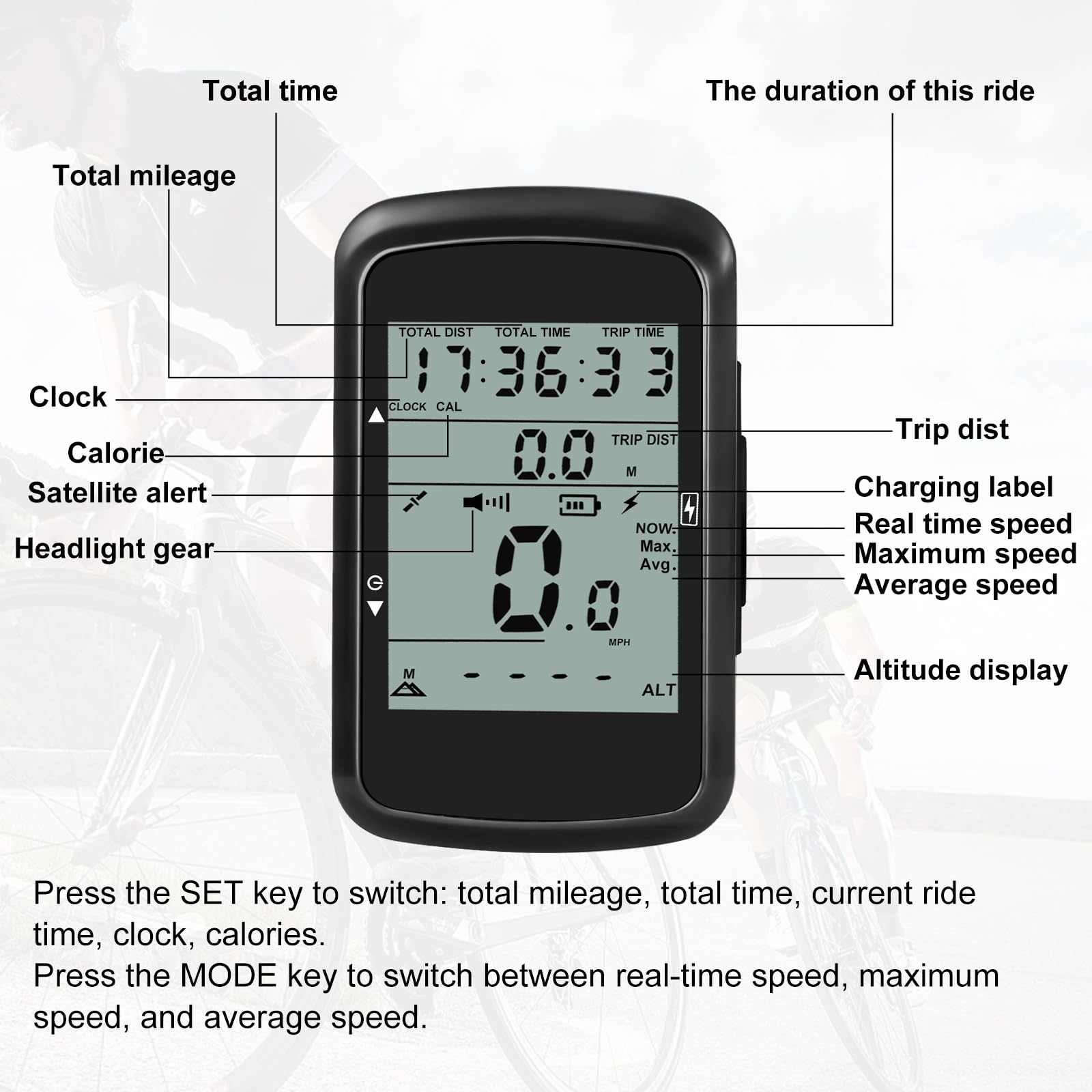 Position cinq étoiles: le satellite ne peut être recherché qu'en plein air, pour la première fois utilisé, il faut quelques minutes pour rechercher le satellite, le symbole du satellite ne clignote plus et représente la recherche par satellite. -Si aucun satellite n'est détecté ou si la vitesse n'est pas affichée dans les 20 minutes, l'appareil s'éteindra automatiquement pour économiser de l'énergie. -Appuyez sur la touche SET et maintenez-la enfoncée pendant 3 secondes pour allumer/éteindre le rétroéclairage. Appuyez sur la touche SET pour sélectionner la valeur souhaitée, appuyez sur la touche MODE pour passer au réglage suivant, puis appuyez sur la touche d'alimentation pour enregistrer et quitter les réglages. -Le kilométrage unique et le temps unique sont les données enregistrées pour ce trajet. Résistants à l'eau et durables pour usage extérieur · Mesure du dénivelé et des variations d'altitude · Connexion possible à des capteurs de fréquence cardiaque... Toutes les données sont effacées automatiquement après la désactivation et les kilomètres totaux et le temps total sont toujours enregistrés et ne sont pas effacés. -Appuyez simultanément sur les touches SET et MODE pendant 3 secondes pour entrer en mode réglage, où vous pouvez régler l'unité de kilométrage (en kilomètres ou en miles) et le poids (en kilogrammes). Appuyez à nouveau pour changer de mode d'éclairage. Accessoire Vélo écran LCD Rétroéclairé Compteur Velo Sans Fil Sigma Bc 100 Wl Ats 10 Fc SIGMA CYCLES DU LOIR Ordinateur Cyclisme étanche IPX5 Compteur vélo,Compteur filaire et sans fil étanche pour vélo,écran LED... 20 minutes sans recherche de satellites ou sans indicateur de vitesse pour économiser de l'énergie, l'appareil s'éteint automatiquement Cliquez à nouveau pour changer les projecteurs. Avec la fonction de mémoire par satellite, l'utilisation ultérieure ne peut être recherchée que dans le plus court délai possible. (ou appuyez sur trois touches SET/POWER/MODE en même temps pendant une seconde) Compteur Vélo Optimiz sans Fil 21 Fonctions Noir pas cher - 36Vélos Sous chaque passage, la longue touche ne pour 3 secondes, le numéro de code et les phares sont éteints, l'écran ne brille pas. Après l'arrêt automatique, elles seront également remises à zéro. - Appuyez sur les touches SET et MODE pendant 10 secondes, et tous les chiffres de l'écran s'allumeront, rétablissant les paramètres d'usine. Veuillez éteindre l'appareil avant de le rallumer à chaque trajet, les données seront alors remises à zéro.