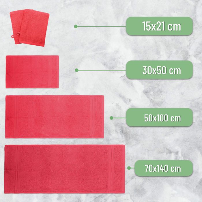 Cet ensemble de serviettes de bain comprend 4 serviettes de bain, 4 serviettes et 4 gants de toilette. Betz Set de 10 Serviettes Premium 100% Coton 2 draps de Douche 4 de Toilette 2 d'invités 2 Gants Couleur Bleu Clair Une solution intelligente pour l'ensemble de serviettes de bain qui garantit un plaisir durable Serviette De Bain Blanche Porte Betz Lot De 12 Serviettes Premium Set De 2 Draps De Bain 4 Serviettes De Toilette 2 Serviettes D'invité 2 Lavettes 2 Gants De Toilette 100% Coton Couleur Sable Serviette Velours Serviette de bain : 70 x 140 cm. Tailles parfaitement adaptées à tous les besoins : vous et votre famille êtes parfaitement équipés pour toutes les situations Lot de 2 tapis de sol super absorbants pour salle de bain... Que ce soit après l'entraînement, au bord de la piscine ou à l'hôtel, avec cet ensemble complet, vous êtes toujours parfaitement équipé Serviettes de bain durables : pour une qualité durable au quotidien. Serviettes de bain,Turban en velours de corail pour femmes, serviette... Extrêmement douces et absorbantes : profitez d'une expérience de séchage agréable avec ces serviettes absorbantes Serviettes éponge de qualité supérieure : pour une sensation de luxe après chaque bain. Nos serviettes ont des ourlets renforcés et conservent leur texture douce même après de nombreux lavages. Matériau : velours corail Dimensions : serviette : 75 x 35 cm. Idéal pour les familles avec plusieurs baigneurs