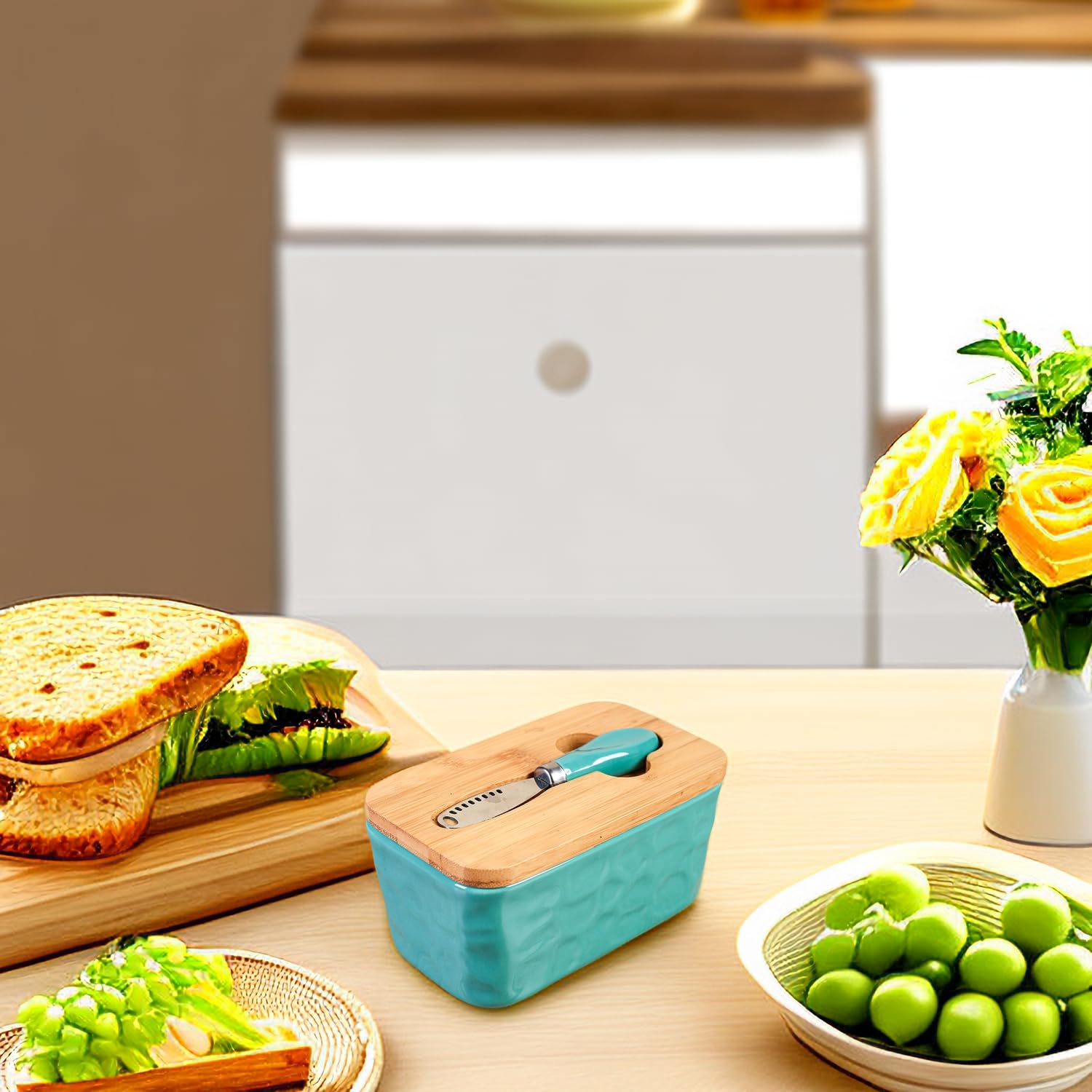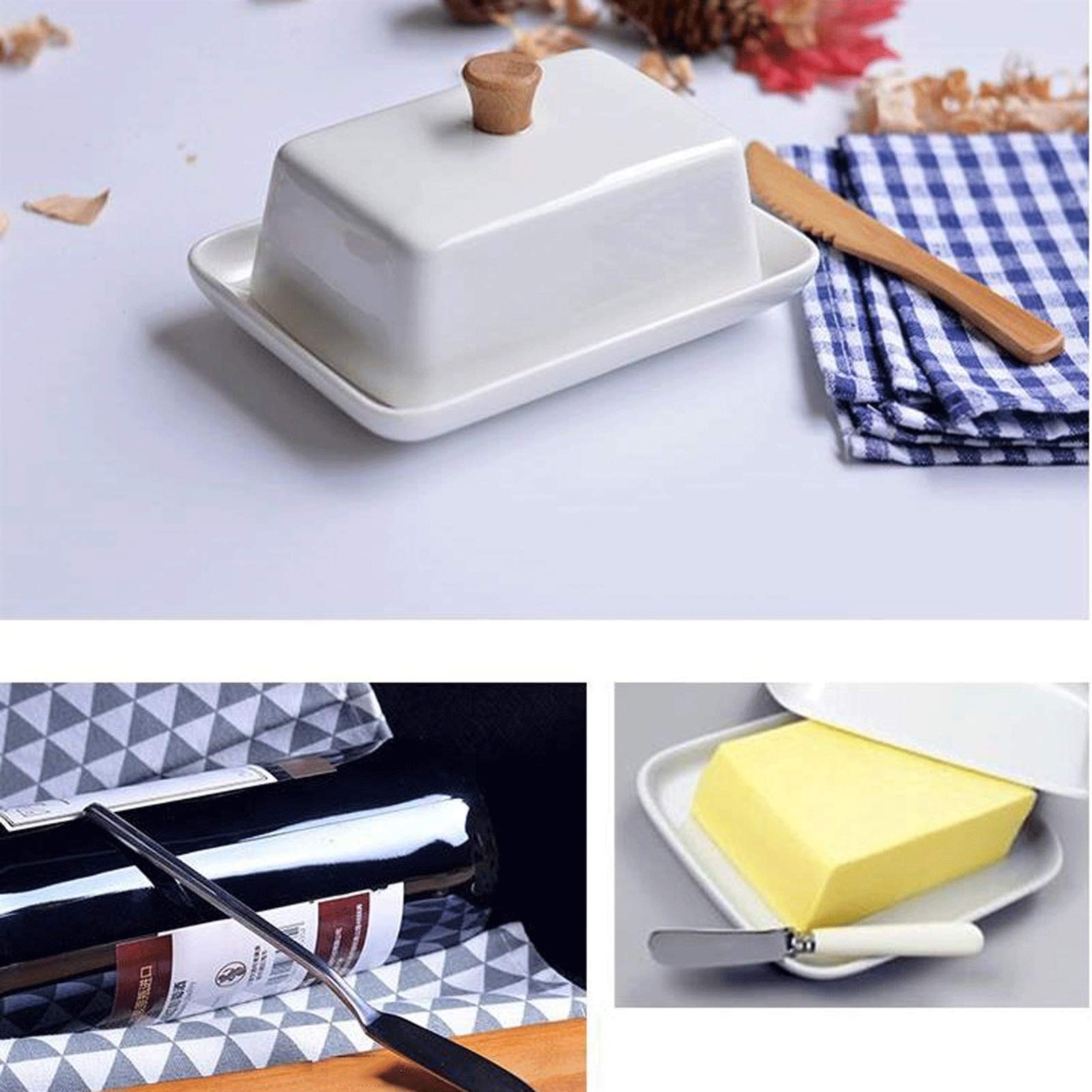Récipient Beurre Frais Beurrier Avec Couvercle - Équipé De Couteau à Beurre - Boîte à Beurrier Céramique Avec Couteau Matériau et taille] Le beurrier est en céramique de qualité alimentaire, sans BPA, difficile à mouler et à rouiller. Le couvercle est en bambou pour une bonne étanchéité et convient à toutes les températures Boîte à Beurre. Beurrier Élégant avec Couvercle en Bois de Résistant à la chaleur et stable: la construction en céramique solide est au micro-ondes et au lave-vaisselle. Beurrier en céramique avec couvercle, équipé d'un couteau, d'un beurrier rectangulaire noir et blanc, utilisé pour les comptoirs, la décoration de cuisine et les salles de stockage du beurre Ce beurre peut simplement être lavé et en sécurité au lave-vaisselle à la main, offre des fonctionnalités polyvalentes dans chaque environnement de cuisine. Longue fraîcheur:le sceau de silicone scellé crée une barrière anti-odeur qui préserve le goût p-ur du beurre et le maintient parfaitement frais pendant longtemps Grande capacité: conçue pour le beurre disponible dans le commerce,la boîte de beurre avec 350 ml de volume offre une manipulation sim-ple. Stockage pratique: le compartiment de couteau intégré et les couvercles renforcés offrent une solution fonctionnelle pour la table à manger.