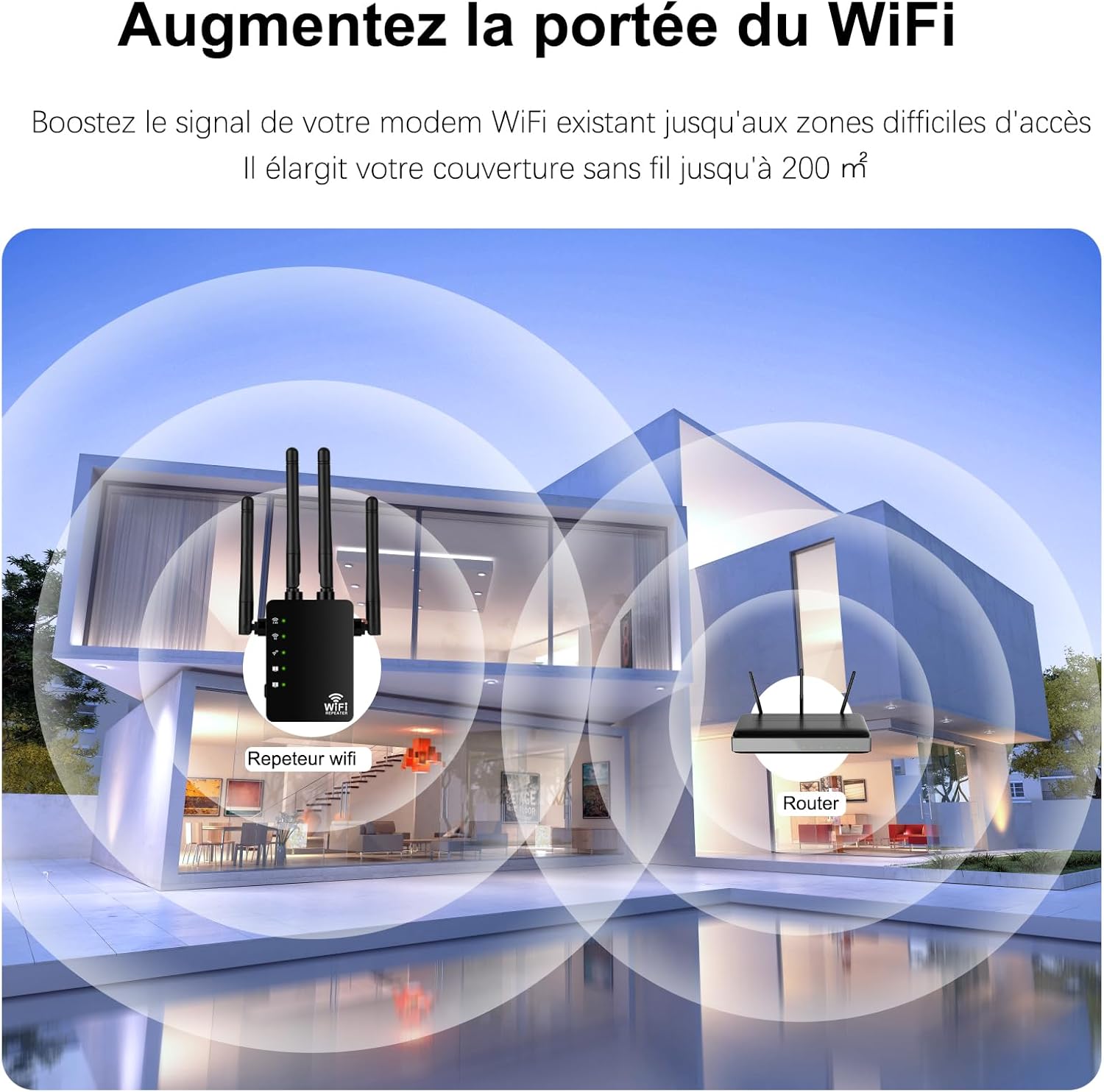 Port Ethernet - Le 2*LAN port ethernet intégré permettant des connexions filaires rapides et stables pour les appareils tels que des PCs, des consoles de jeux, ou des lecteurs vidéo, etc. éliminer Zone Morte WiFi Répéteur WiFi Bi-bande AC1200 – 4 Antennes Gain élevé – Port Compatible Toutes Box Boostez le signal WiFi où vous avez besoin ! Répéteur Wifi Ac1200Mbps, Amplificateur Wifi, Extendeur Wifi, Booster Wifi, Extension de... Vitesse de transmission WiFi de 1200Mbp/s Le répéteur wifi fournit une double bande (2,4 GHz et 5 GHz) pour transmettre des signaux WiFi, doublant ainsi les performances d'une seule bande ; les deux bandes 2,4 GHz (300 Mbit/s) et 5 GHz (867 Mbit/s) vous permettent de connecter plusieurs appareils en même temps ; vous puissiez profiter de vidéos haute définition, de jeux et de vitesses Internet haut de gamme. Profitez d'une expérience réseau AC1200 stable et à haut débit où que vous soyez à la maison. Répéteur WiFi ME50G, Amplificateur Bi-bande WiFi AC1900 Mbps, Extender WiFi, Deux antennes à... Port Ethernet Avec ce ports, branchez en filaire des appareils tels que des PCs, des consoles de jeux, ou des lecteurs vidéo, etc, Réduire la perte de transmission sans fil et profiter d'un réseau à haut débit Le répéteur wifi AC1200 se connecte WiFi à votre Box Internet, Étendez votre Wi-Fi aux zones difficiles d'accès et éliminez les zones mortes Wi-Fi. Facile à installer - Profitez d'une installation rapide grâce à la fonction WPS. SOKUMI Répéteur WiFi Puissant 1200 Mbps Amplificateur WiFi Puissant Configuration facile Appuyez sur le bouton WPS de votre Box Internet ( routeur) et sur le bouton WPS de votre répéteur pour étendre votre couverture WiFi en quelques secondes En un clic, étendez facilement votre réseau WiFi sans avoir besoin de configurations compliquées.