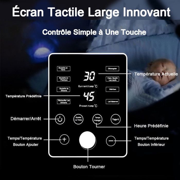 Chauffe Lait Bébé 8 Fonctions Voyage Chauffe Biberon Bebe - 8 En 1 Chauffe-Biberons Électrique Chauffe Biberon Mam Chauffe Biberon, KYG Stérilisateur Biberons Sans Eau pour Bébé, Nouveau Chauffe Biberon, Universel Chauffe-Biberons Réchauffeur De Biberon Sac... Construit avec des matériaux de haute qualité, il est léger et chauffe rapidement les biberons – parfait pour les parents occupés en déplacement. Spécification:Matériel: acier inoxydable + PPTaille du produit: environ 27x12x12,3 cm/10,63x4,72x4,84 poucesPoids : environ 600gPuissance : 150WListe de produits :1 * chauffe-biberon de voyage1 * manuel d'utilisationRemarques : En raison des différents paramètres d'éclairage et d'écran, la couleur du produit peut être légèrement différente de celle de l'image. Réchauffement rapide et uniforme : avec un contrôle intelligent de la température et un chauffage rapide, ce chauffe-biberon de voyage garantit que les aliments atteignent la température idéale sans détruire les nutriments précieux. Chauffe-Biberon et Stérilisateur, Décongelation, Mode Rapide, Chauffe Petit Pots, Pour Lait Maternel ou en Poudre, Arrêt AutomatiqueCe chauffe-biberon portable facilite le quotidien ! Multifonction : doté de huit fonctions, notre chauffe-biberon de voyage est un outil polyvalent qui peut s'adapter aux différents besoins des , rendant la vie quotidienne plus facile et plus pratique pour les parents. La fonction de protection contre les brûlures sèches offre une sécurité supplémentaire, ce qui en fait le complément parfait à votre vie quotidienne Facile à transporter : ce chauffe-biberon de voyage, conçu avec une structure compacte et légère, se glisse facilement dans n'importe quelle poche, ce qui le rend parfait pour les voyages et les courts voyages. SEJOY Chauffe Biberon 7-En-1 Pour Bébé-Double Stérilisateur à Vapeur...