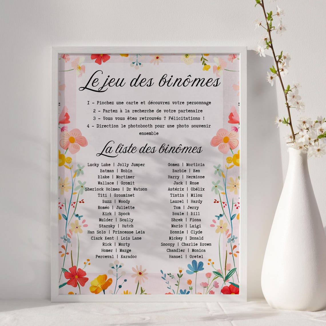 Jeu Des Binômes Avec Prénom Le Jeu Des Binômes - Version Pays-capitales - Sticker Or | Un Lundi De Jeu Des Binômes Animation Jeu des binômes à imprimer - Carte jeu des binômes PDF - Jeu des duos Jeu des bnômes thème champêtre- Jeux de marage - Actvtés marage... Idéal pour briser la glace lors de mariages, soirées d'entreprise, anniversaires ou tout autre rassemblement. Le kit inclut une notice d'explication détaillée et une liste d'exemples de binômes pour vous inspirer. Une façon ludique et élégante de créer des connexions entre vos invités et d'immortaliser ces moments avec des photos. Les stickers cœur dorés à gratter ajoutent un élément de surprise et de mystère à l'activité. Non recommandé pour les enfants de moins de 3 ans. CONTENU DU KIT: Ensemble complet comprenant 20 cartes de jeu (10x15 cm), 20 stickers cœur à gratter (7x8 cm), une notice explicative et une liste d'exemples DESIGN ÉLÉGANT: Cartes décorées de motifs floraux délicats et stickers cœur dorés pour un effet sophistiqué Créez votre jeu des binômes personnalisé pour animer votre mariage. Choisissez vos catégories de personnages, sélectionnez un template et téléchargez votre PDF prêt à imprimer