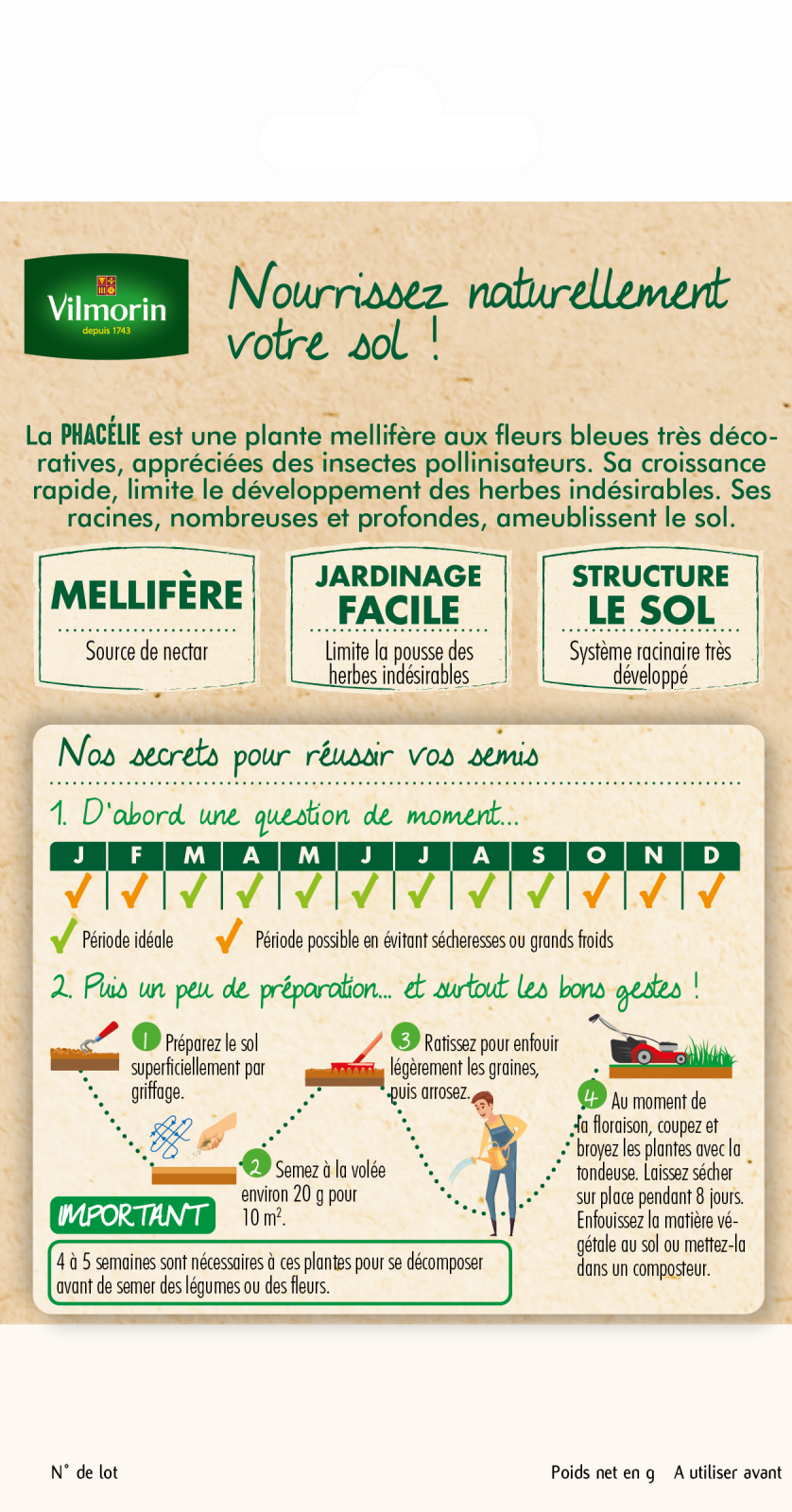 Graines de Phacélie BIO , boite de 60 grs. Vilmorin. 3,00 €. 3,75 €. TTC ... Sachet graines Fleurs Mellifères en mélange pour engrais vert BIO. Ajouter à la... Sachet graines Chicorée à feuilles Grumolo Verde - VILMORIN - Gamm vert Engrais Liquide Plantes Vertes Intérieur Vilmorin - Semillas De Esparceta Bio Gran Modelo - 350 G - Jardiland Engrais Plantes Vertes Intérieur Pot Fleur Vilmorin Sachet Graines Fleurs Mellifères - Mélange Pour Abeilles Et Papillons - Hauteur 30cm - Semis Facile Plantes Mellifères Facile