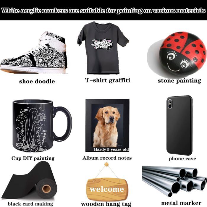 Lot De 12 Marqueurs Pour Tableau - Largeur De Trait : 2-3 Mm - Pointe... Exprimez votre personnalité sur une variété de supports textiles, comme le coton, le lin ou le polyester, quels que soient le support, le style et le projet. Séchage rapide et imperméable : l'encre à base d'eau imperméable est imperméable et sèche rapidement, offre une forte résistance à l'eau, une forte couverture, sans odeur, adaptée à la peinture et à l'écriture sur une variété de matériaux. Marqueur Blanc Permanent Marqueur Mecanicien RiyaNed - Imperméable, Séchage Rapide | Idéal Pour Pierre, Bois, Verre, Tissu Peinture Pour Verre Marqueur Séchage Rapide Matériau du stylo acrylique : Le corps du stylo est en plastique, ce qui le rend confortable à tenir. Vêtements chauffants pour chiots – Vêtements pour chiens de compagnie... Cet ensemble comprend 4 marqueurs blancs. RiyaNed marqueur blanc permanent,8 pièces Feutre Acrylique,Imperméable