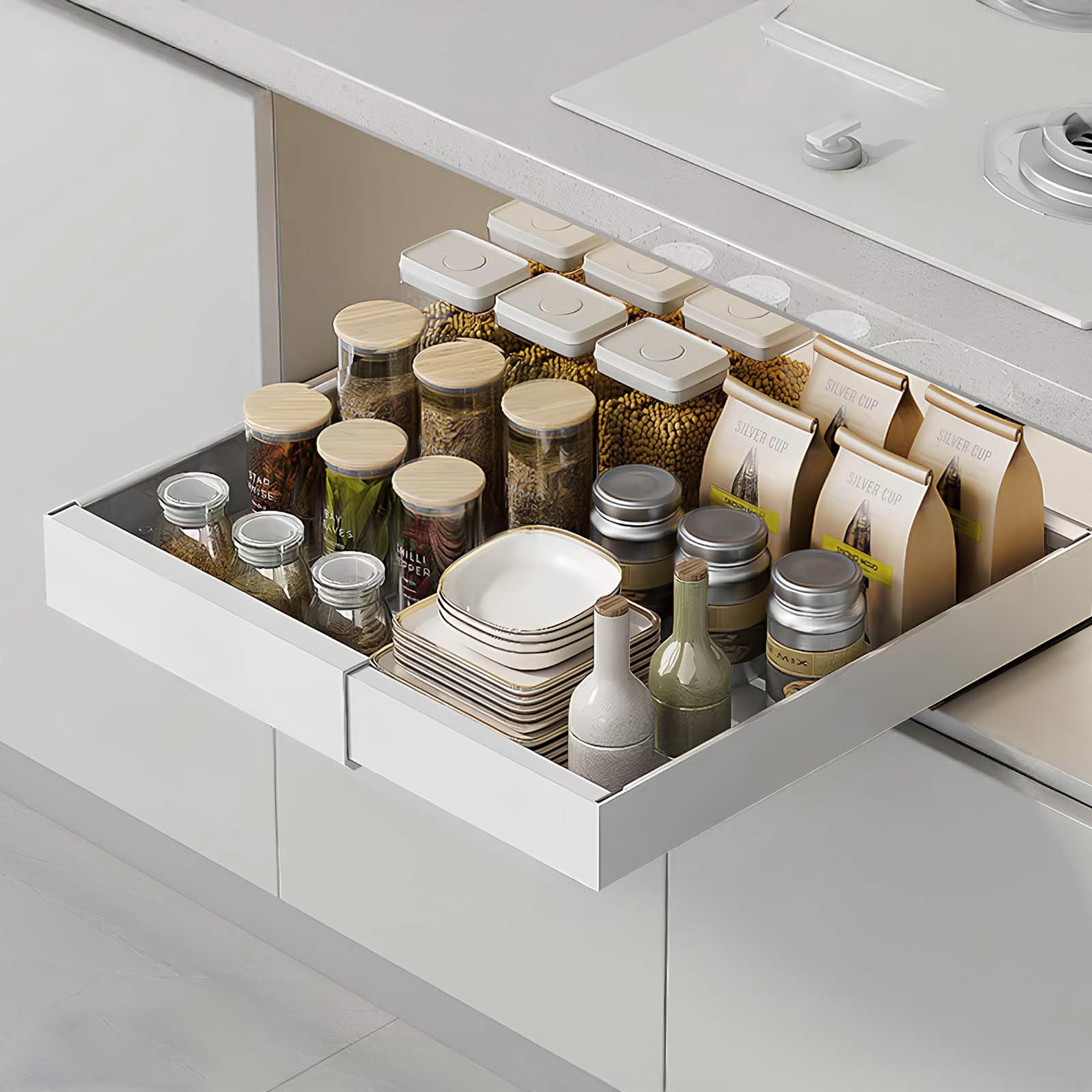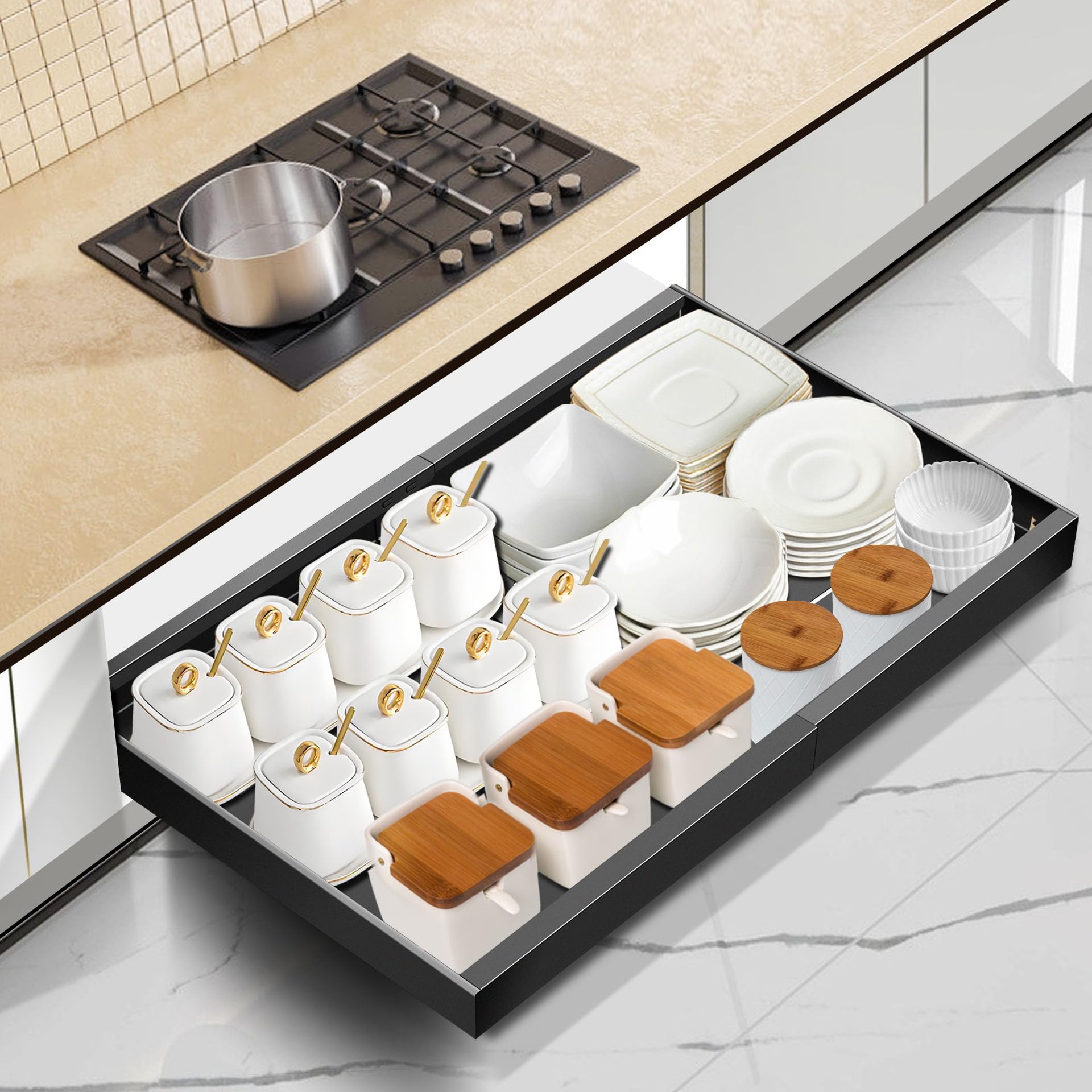 Parfait partout où vous voulez garder les choses bien rangées, telles que vos armoires de cuisine, sous l'évier, le placard, la salle de bain, le garde-manger... Glissière douce et silencieuse : avec la technologie de roulement à glissière silencieuse, ouverture et fermeture silencieuses, idéale pour les matins calmes ou les soirées tardives. Il est idéal pour ranger tous les types de bouteilles, canettes et autres ustensiles de cuisine sans vous soucier de la stabilité. Tiroir Extensible Coulissant Cuisine Organisateur Cuisine Blanc Tiroir Télescopique Blanc Pour Armoire - Rangement Sans Perçage, Largeur 30cm Tiroir Telescopique Largeur 30 Cm Tiroirs Extensible Matériau de qualité supérieure : fabriqué en acier résistant à la corrosion avec une surface anti-rayures - Durable et facile à nettoyer (essuyer avec un chiffon humide). Tiroir Télescopique,Separateur Tiroirs Organisateur,11,7-19,7... Multifonction et réglable : idéal pour les tiroirs de cuisine, peut contenir des épices, des bouteilles d'huile, des ustensiles de cuisine et plus encore. Ikodm Tiroir de cuisine, télescopique, 2 x 60 cm, en métal, extensible