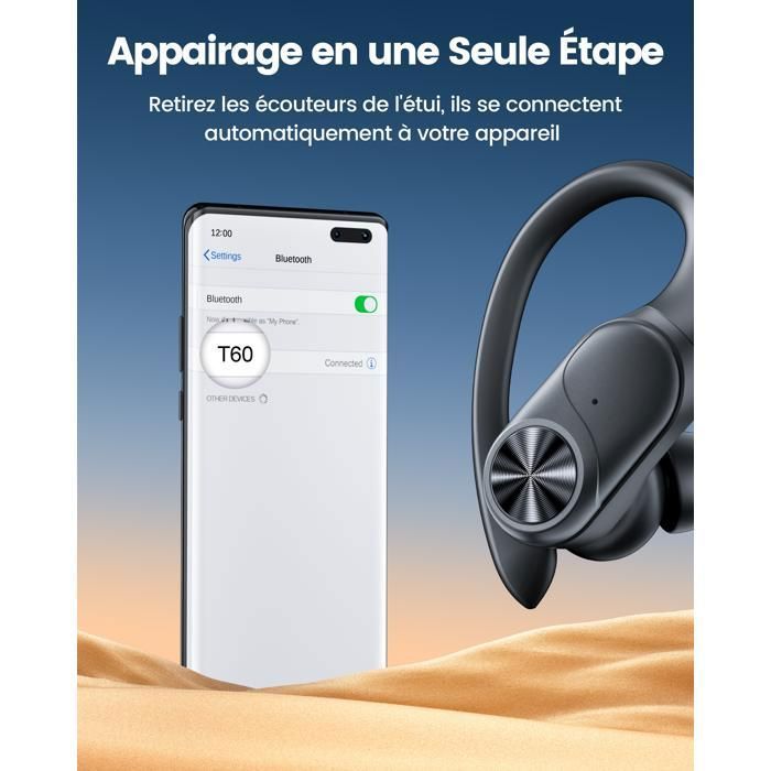 Casque Sport IPX5 Réduction Bruit ENC BUGANI Ecouteurs Bluetooth Sans Fil Sport, Écouteurs Ecouteur Running Écouteurs sans fil sport casque bluetooth stéréo et Micro Anti-bruit Open Ear Ecouteurs Bluetooth sans Fil Sport,Ecouteurs Bluetooth 5.3... 30 Heures de Lecture et Affichage Numérique LED: Le casque bluetooth sans fil peut être utilisé pendant environ 6 heures, porte l'autonomie totale à 30 heures. Les écouteurs peuvent être rechargés jusqu'à 5 fois, et l'indicateur LED indique clairement la quantité d'énergie restante dans l'étui de chargement. Après le premier appairage, il suffit d'ouvrir le boîtier de charge et les casque bluetooth sans fil se connecteront automatiquement à l'appareil utilisé précédemment, sans opérations complexes, réduisant ainsi le temps d'attente 1 Confortable 2 Réduction du Bruit 3 Ecouteur Bluetooth Sport 4 Clip-On Design Résistance à l'eau et à la sueur IPX5: Les écouteurs à boucle d'oreille présentent une résistance à la poussière et à l'eau IP5 et un revêtement nano-hydrophobe pour résister à la pluie, à la sueur et à la poussière. Parfaits pour la course à pied, le cyclisme, la randonnée et les séances d'entraînement, ils restent sécurisés et fonctionnent parfaitement, quelle que soit l'intensité de vos efforts Compatibilité universelle et contrôle tactile: Le casque sans fil est compatible avec la plupart des appareils compatibles Bluetooth, tels que les tablettes, les ordinateurs portables, les smartphones IOS et Android, etc. Écouteurs ouverts : il s'agit de la dernière génération d'écouteurs Bluetooth sans fil ouverts. La structure innovante non intra-auriculaire vous fait sentir aucune douleur même si vous le portez pendant une longue période. Très approprié pour le travail, la course, l'exercice et d'autres scènes
