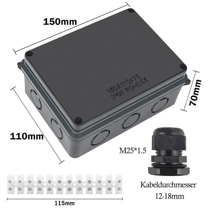 Boîtier électrique ABS IP66 Boîte De Jonction Étanche IP66, Boîtier Électrique Industriel En ABS, Anti- Poussière, Pour Installation Extérieure Et Intérieure, 100x68x50mm Boîte De Dérivation Ignifuge Que ce soit pour l'installation d'un éclairage de jardin, d'une caméra de surveillance ou d'autres équipements électriques, la boîte de jonction étanche permet de garder les connexions à l'abri de l'humidité, de la poussière et des intempéries Boîte électrique de jonction, boîte de jonction étanche à la poussière 【Boîte de jonction de protection IP66】: Cette boîte électrique est résistante à la poussière et à l'eau, le degré de protection est IP66 et pourrait protéger efficacement la boîte. Lwuey Boîtier Projet Plastique Jonction, Dérivation étanche Electrique... 【Bonnes performances d'étanchéité The: La boîte de jonction en plastique ABS IP66 a de bonnes performances d'étanchéité, avec une longue durée de service. Le forfait comprend : 1 x boîtes de jonction étanches Remarque : 1., Veuillez permettre une erreur de 1 à 5 mm en raison de la mesure manuelle. Merci de votre compréhension., 2., Les moniteurs ne sont pas calibrés de la même manière, la couleur de l'élément affichée sur les photos peut être légèrement différente de l'objet réel. Oumefar Boîte de jonction étanche à la poussière, boîte de jonction en Plastique ABS IP66, boîtiers électriques Universels, boîtier de Projet(65 * 60 * 35mm)(100x68x50mm) Spécifications : Matériau : ABS thermoplastique Taille (facultatif) : Petit : 63 x 57 x 35 mm/2,48 x 2,24 x 1,37 Grand : 98 x 66 x 48 mm/3,85 x 2,59 x 1,88 Couleur : comme le montrent les images Quantité : 1