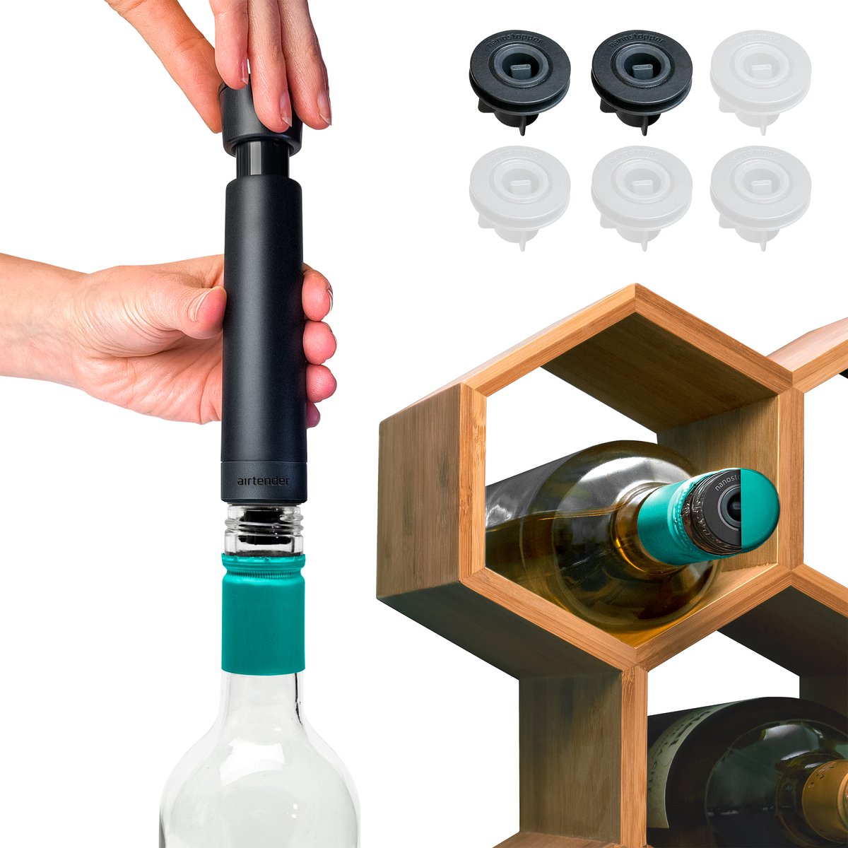 Toutes les pièces sont réutilisables et compatibles avec le lave-vaisselle. Pompe à Vide Aliments Et Boissons Airtender Set Sous Vide Bocaux & Bouteilles - Pompe à Vide - 6 Bouchons à Vin - Coffret Cadeau Pompe à Vide Pour Bouteilles Et Bocaux 6X NANOSTOPPERS INCLUS : Convenant aussi bien aux bouteilles bouchées qu'aux bouteilles à vis, ces bouchons conserveront la qualité de votre vin jusqu'à 5 fois plus longtemps. AIRTENDER - VACUÜM permet au vin de rester frais plus longtemps et de conserver son goût parfait. Conservez vos aliments jusqu'à 5 fois plus longtemps, avec un minimum de déchets et un maximum de goût. MADE IN THE NETHERLANDS - AIRTENDER GOES FOR MAXIMUM TASTE AND AROMA : Gardez le vin et les aliments frais plus longtemps et préservez leur goût parfait. Ensemble sous Vide Airtender - Alimentaire/vin | Magasin Grâce à la pompe à vide et aux bouchons Nano, vous pouvez conserver vos aliments et boissons jusqu’à cinq fois plus longtemps en ralentissant le processus de vieillissement. De plus, l'assemblage et l’emballage ont lieu dans des ateliers intégratifs, soutenant ainsi la responsabilité sociale. Le set Airtender Vakuumset est non seulement fonctionnel, mais aussi respectueux de l’environnement. Désormais, les bouteilles de vin ouvertes sont conservées couchées, étanches et sous vide dans un casier à vin, une glacière ou une armoire climatisée. Conservez les bouteilles ouvertes à l'abri des fuites et sous vide, que ce soit dans un casier à vin, un réfrigérateur ou une armoire climatisée. Permet une conservation sous vide rapide et efficace de vos aliments frais, préparations ou restes. Idéal pour prolonger la fraîcheur et les arômes de vos bouteilles de vin ou de boissons ouvertes Pour la fermentation : • Utilisez un bocal à armature pour votre préparation • Réalisez votre mise sous vide avec le couvercle et le bouchon Nanostopper • Fermez le couvercle du bocal et verrouillez Astuces pratiques : Le bouchon est équipé d'un indicateur de vide. Les bouchons sont réutilisables et passent au lave-vaisselle Ce set complet comprend une pompe à vide puissante, un perforateur de couvercles pratique, six bouchons Nano polyvalents et un clip de rangement pratique. Le perforateur de couvercles transforme les bocaux de conservation en récipients sous vide efficaces pour un stockage sûr des aliments. Livré dans une boîte en carton robuste, idéale pour le rangement, ce set contient tout ce dont vous avez besoin pour une cuisine organisée et respectueuse de l’environnement. Découvrez la fraîcheur innovante avec le set Airtender Vakuumset pour verres et bouteilles.