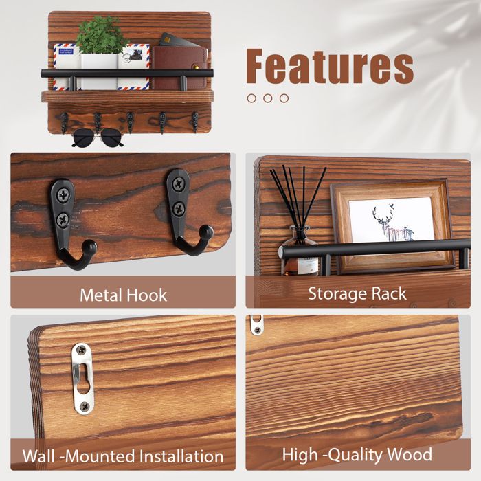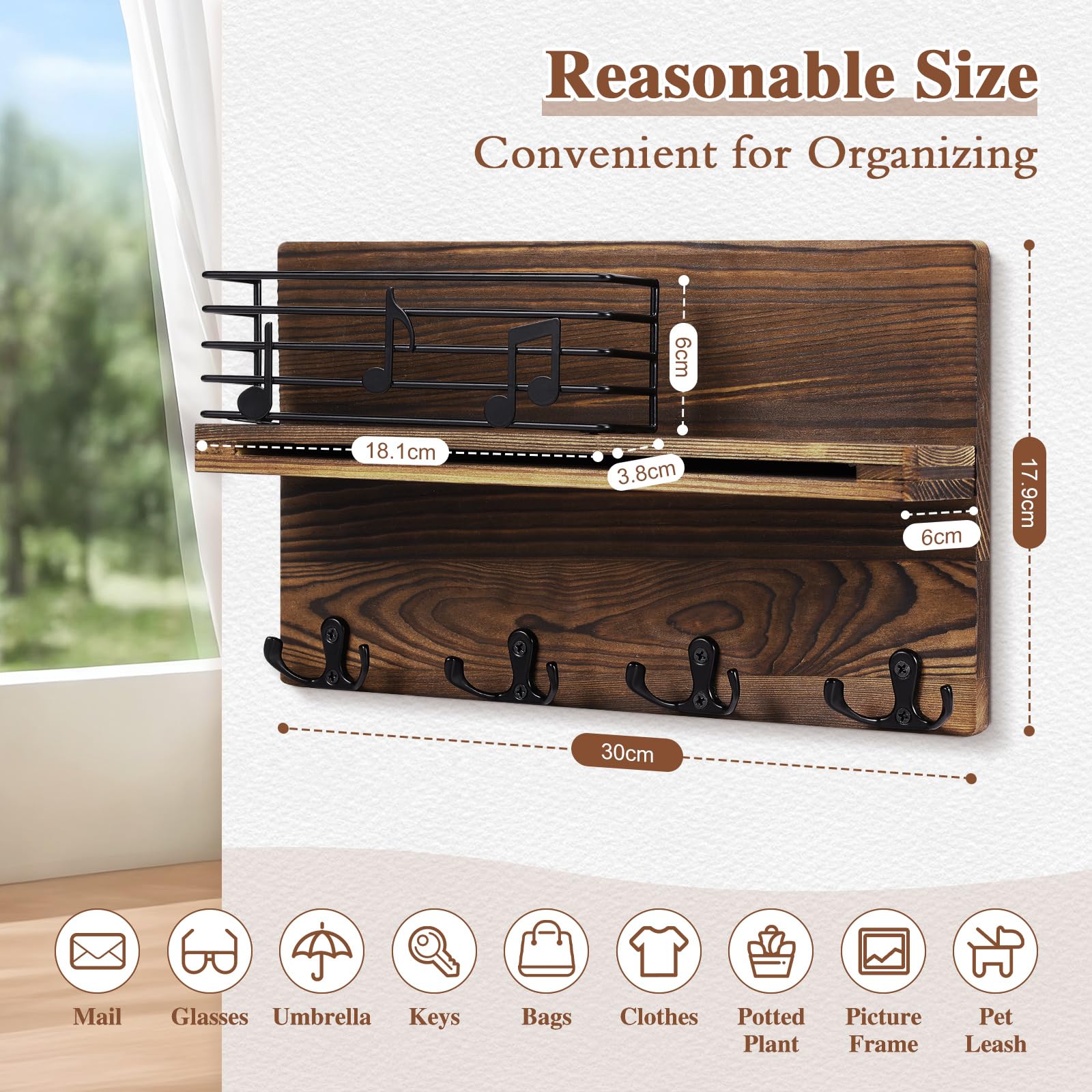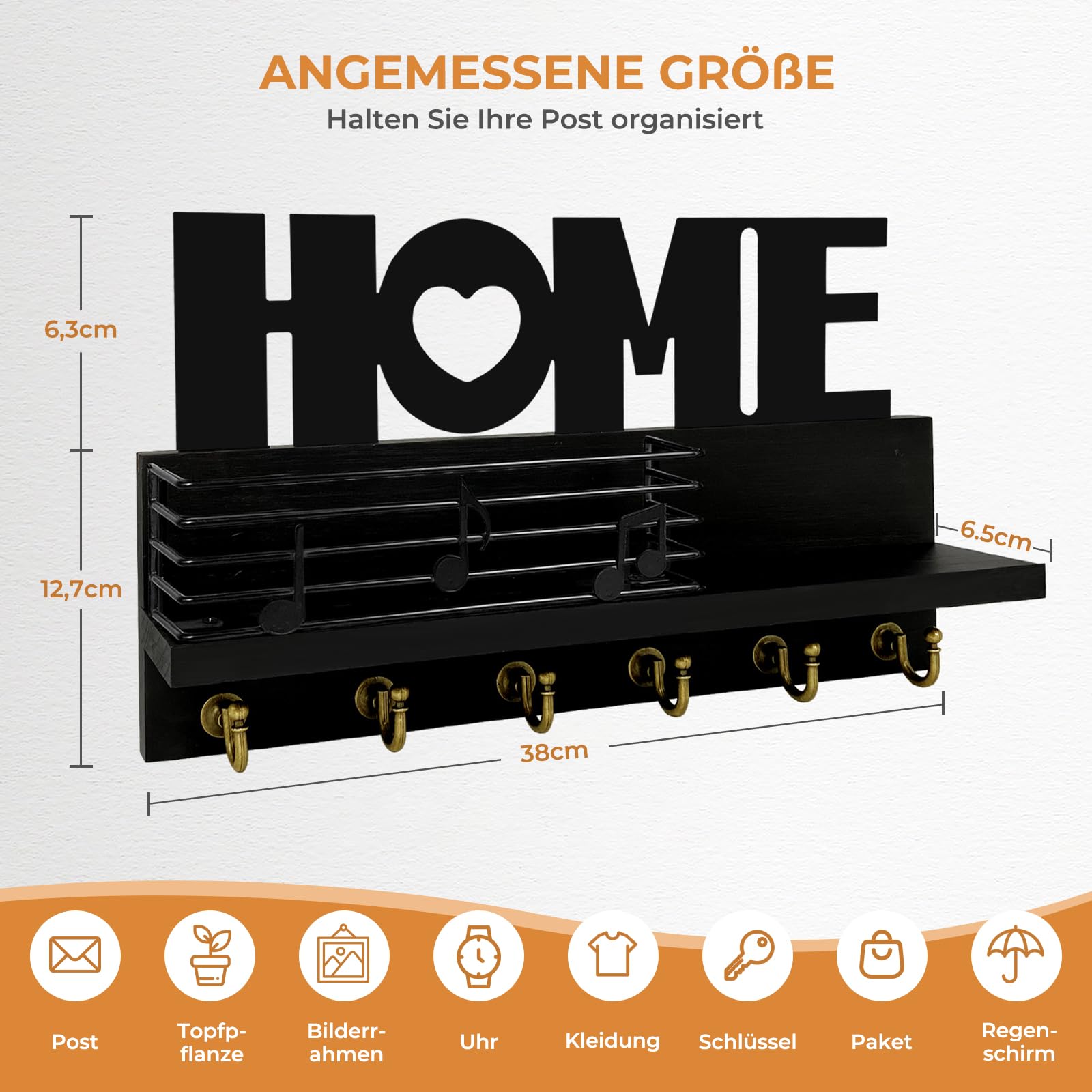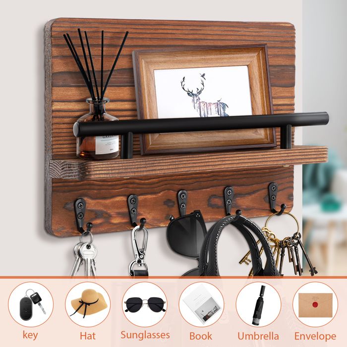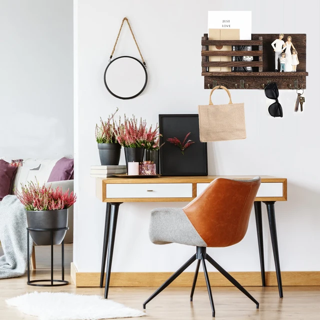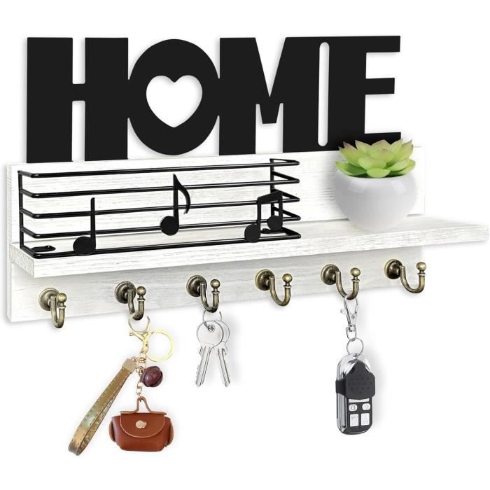 Taille Parfaite pour Tout Espace : Notre organisateur de courrier mural a la taille idéale, parfait pour être suspendu dans le salon, la chambre ou le bureau. Convient pour le montage sur différentes surfaces murales , 1., Fixez la clôture métallique noire à la planche., 2., Fixez les planches en bois avec des vis argentées., 3., Mesurez le point (206 mm) à l'aide d'une règle., 4., Percez des trous aux deux points., 5., Insérez le tube d'expansion., 6., Insérez la vis dorée dans le tube d'expansion. Rangement Mural Entrée Clés Parapluie Porte Clef Mural Bois à 4 Double Crochets Boîte à Clés Vintage, Boite A Support Clés Vintage Design Armoire Crochet Mural Boite a Clefs Murale Porte Clef Mural Organiseur... Idéal comme porte-clés, organisateur pour le courrier, le portefeuille, le parapluie, les lunettes de soleil ou comme idée de cadeau. Description du produit porte clé mural à 4 crochets pour rangement des clés et courrier à l'entrée 1 Bois naturel 2 Boîte aux lettres métal 3 Crochets métalliques 4 Fixé au mur Son design élégant en fait un cadeau idéal pour une pendaison de crémaillère ou un mariage, parfait pour ceux qui apprécient à la fois la fonctionnalité et le style. Étagères Multifonctionnelles et Organisateur de Clés : Ce porte-clés mural combine des compartiments pour le courrier, des étagères flottantes, des fentes horizontales et 4 crochets doubles en métal robuste pour maximiser l’espace mural et garder tout organisé. Le rangement en bois pour clés dans l'entrée utilise de manière optimale l'espace de votre mur. Une fois assemblé, la longueur totale de ce porte-clés adhésif mural est de 30 cm, la hauteur de 17,9 cm et la profondeur de l’étagère de 7 cm. 1 l'entrée 2 Cuisine 3 Chambre 4 Bureau 5 Garage Étagères Multifonctionnelles et Organisateur de Clés : Ce porte-clés mural combine des compartiments pour le courrier, des étagères flottantes, des fentes horizontales et 4 crochets doubles en métal robuste pour maximr l'espace mural et garder tout organisé L’organisateur de clés et de courrier vous aide à ranger clés, courrier, portefeuilles, lunettes de soleil, chapeaux, parapluies, laisses pour chiens et plus encore : fini les objets perdus dans le chaos quotidien ! Exempt de produits chimiques nocifs, il dégage une subtile odeur de bois et peut supporter jusqu’à 9 kg sans se déformer, se plier ou s’écailler ! Avec un organisateur pour courrier, une étagère flottante, un emplacement pour clés et 4 doubles crochets, vous pouvez organiser de petits objets. Porte Clef Mural Bote Cl Murale En Bois, Porte Clef Maison Blanc, Support Courrier Mural Avec 6 Crochets Et Tagre Porte Manteau Mural