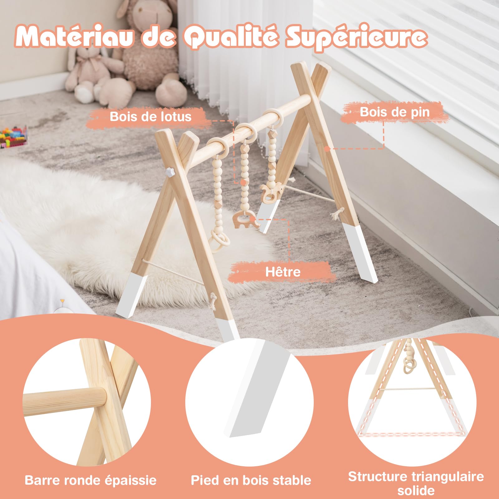 Portique d'éveil en bois - arche de jeux blanc - JaBaDaBaDo Découvrez tous les produits boulier montessori chez Nature et Découvertes. Livraison offerte dès 49€ d'achats. Retrait gratuit en magasin sous 1h Portique éveil Bébé Bois BINYI Arche Portique Deveil Eveil Bebe Bois Arche De Jeux Bébé Jouet Poussette 4 Pièces Jouet Portique éveil Crèche écologique Sans danger pour l'environnement : notre salle de jeux est fabriquée à partir de bois de pin respectueux de l'environnement, sûr et inoffensif pour votre nouveau-né et l'environnement. Divertissement facile : cette salle de sport d'activités pour tout-petits est conçue pour convenir aux poussettes et aux berceaux, afin que vous puissiez divertir votre nouveau-né n'importe où. Portique bébé - LCP Kids - Arche de jeu en bois avec jouets suspendus... Avec 3 jouets à saisir en bois et un cadre de gymnastique en bois, ce jouet les aide à attirer leurs sens et à développer leurs premières capacités motrices. Les crochets en C sont faciles à appliquer et à retirer, ce qui permet de basculer facilement entre différents jouets. Pratique et facile à plier pour le rangement. Installation sans effort : améliorez l'aire de jeu de votre nouveau-né avec cette salle de sport facile à installer composée de jouets en bois légers.