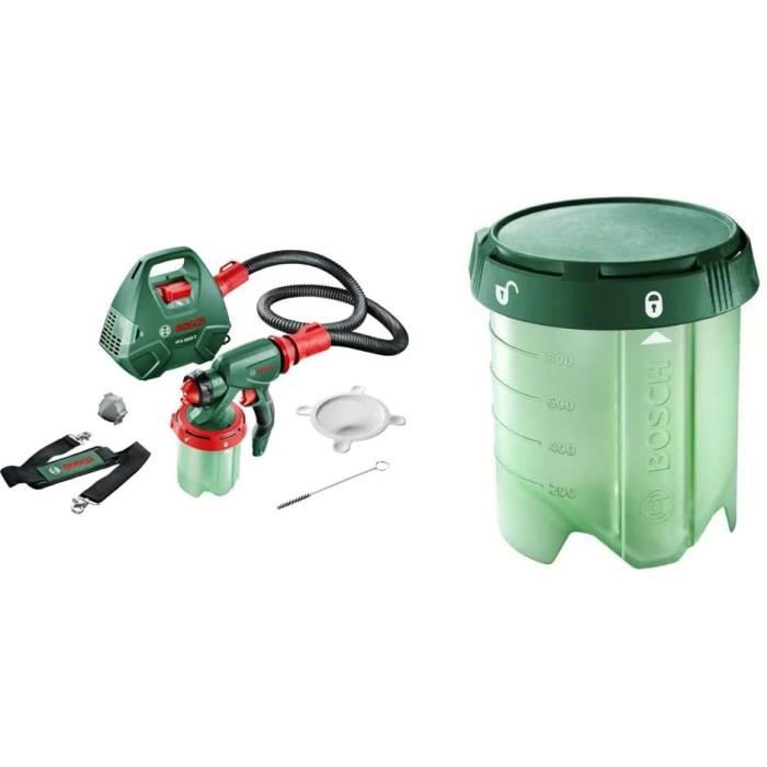 Pulvérisation dans différentes positions Pistolet à peinture mécanique Bosch Pistolet à peinture PFS 5000 E Le pistolet à peinture PFS 5000 E - Le concentré de puissance pour peintures non diluées Nettoyeur Vitre Bosch Pistolet à Peinture PFS 1000 (410 Watts, Récipient De Peinture 800 ML, Buse Pour Peintures Et Lasures, Bandoulière, Dans Un Carton Pistolet Peinture Bosch Il peut être utilisé avec la plupart des peintures et lasures, soit sans dilution soit avec une faible dilution. Grâce au godet ConstantFeed, il assure une bonne pulvérisation. Bosch Pistolet à Peinture PFS 5000 E (2 Godets de 1000 ML, buse pour Peinture Murale (Blanche) / lasures (Grise) / Vernis (Noire), Filtre à Peinture, Brosse de... Régulation possible de l’application de peinture par réglage en continu du débit d’air Le pistolet à peinture possède des roues et un tuyau de 4 m assurant une grande liberté de mouvement et permettant de déplacer le traîneau facilement d’une pièce à une autre. Le pistolet à peinture Bosch PFS 5000 E est le plus puissant et le plus polyvalent de sa catégorie. Il permet d'appliquer des couches homogènes sur toutes les structures avec un rendement remarquable de 3 m²/min. Les deux godets de 1 000 ml Si : - Trop de brouillard : réduisez - Pulvérisation n’est pas assez fine : augmentez Réglage facile du débit d’air Rangement facile du tuyau et des buses Bosch ALLPaint : PFS 5000 E Puissant moteur pour différents types de peintures Le PFS 5000 E est doté d’un puissant moteur de 1 200 W assurant une pulvérisation uniforme et homogène avec peu de dilution. Alimentation en peinture homogène et constante lors des travaux en hauteur ou près du sol grâce à la technologie ConstantFeed