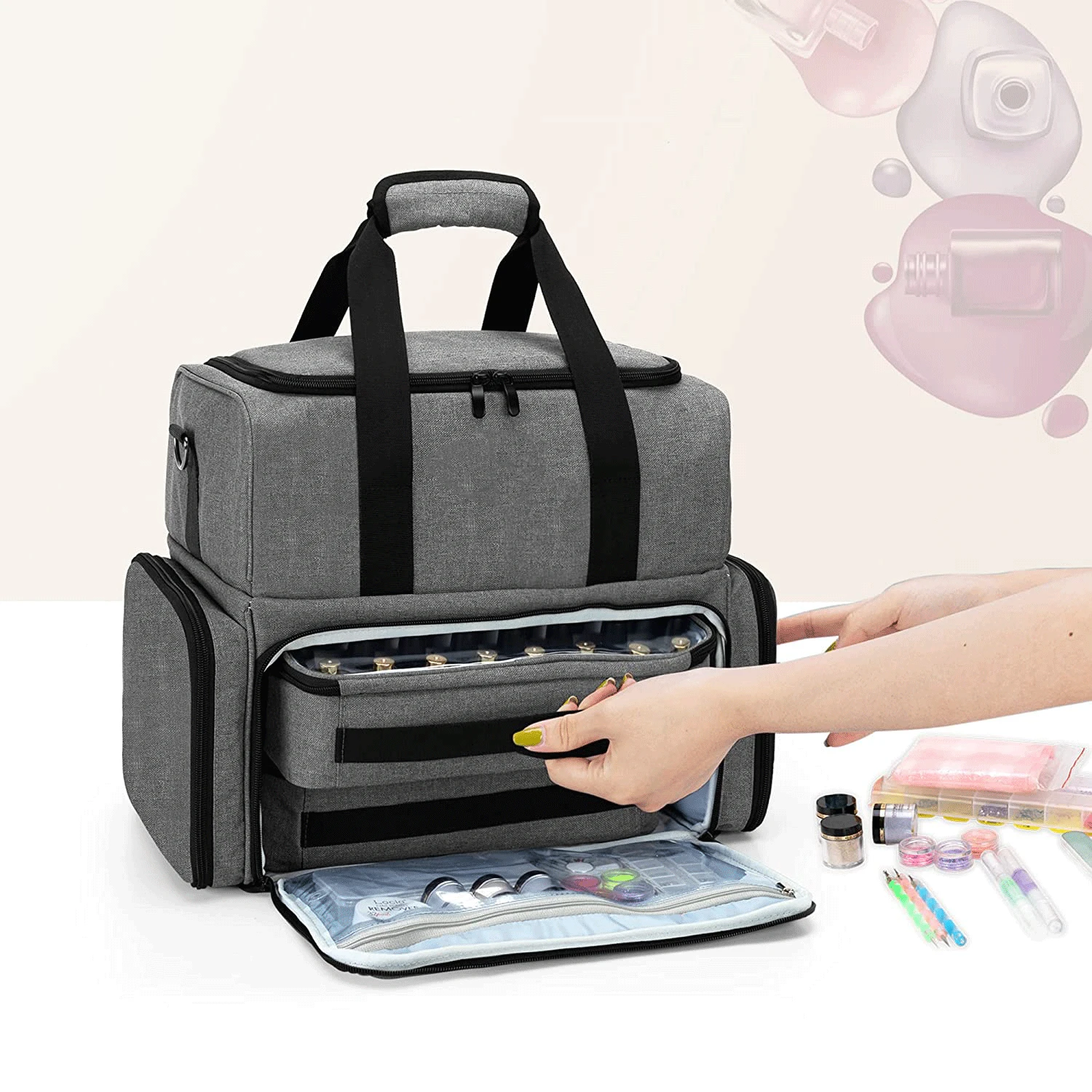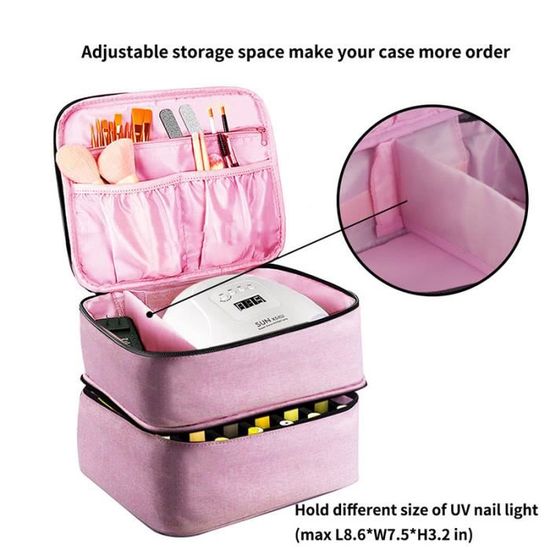 Cet organiseur de vernis à ongles offre un espace généreux pour vos cosmétiques. Elle protège non seulement vos cosmétiques, mais ajoute également une touche d'élégance à votre quotidien. Que vous alliez à la salle de sport, en voyage d'affaires ou en vacances, cette trousse de maquillage est la solution idéale pour organiser votre maquillage et la transporter facilement. La couche inférieure comprend six poches élastiques, une poche zippée et un compartiment amovible en EVA pour vernis à ongles pouvant contenir jusqu'à 30 flacons de vernis à ongles de 15 ml. Sac portable imperméable double couche pour 30 vernis à Les doubles fermetures éclair sont lisses et résistantes à la rouille, ce qui le rend facile à nettoyer et à entretenir. La couche supérieure comprend deux poches élastiques ouvertes, une poche zippée et une poche principale avec séparateurs réglables. Boîte de rangement pour vernis à ongles avec compartiment de rangement pour outils à ongles. Sac de rangement multifonctionnel portable pour vernis à ongles. Indispensable pour les voyages, les dortoirs, la famille. Idéal comme cadeau pour les amis, les enseignants, les demoiselles d'honneur, les anniversaires, les mamans Elle est parfaite pour les courts séjours ou pour un usage quotidien à la maison. 【Conception double couche】 Cet Sac de Rangement Vernis à Ongle double couche comporte deux compartiments. Son format pratique et sa légèreté la rendent facile à glisser dans votre sac à main ou votre bagage. Malette Onglerie BAFASO Sac De Rangement Vernis à Ongle Pour 40 Bouteilles (15 ML - 0,5 FL.oz) Et Lampe UV Sèche Sac Double Couche Vernis à Ongles 30 Flacons Voyage Rangement modernisé : cet organisateur de vernis à ongles double couche dispose de 30 emplacements dédiés avec doublure en EVA pour ranger les bouteilles, tandis que le compartiment supérieur peut accueillir des sèche-ongles, des kits d'outils, et plus encore 【Trousse de maquillage polyvalente et élégante】 Cette trousse de rangement pour vernis à ongles au design élégant peut servir de trousse de maquillage, de trousse de toilette, d'organisateur de voyage et bien plus encore.
