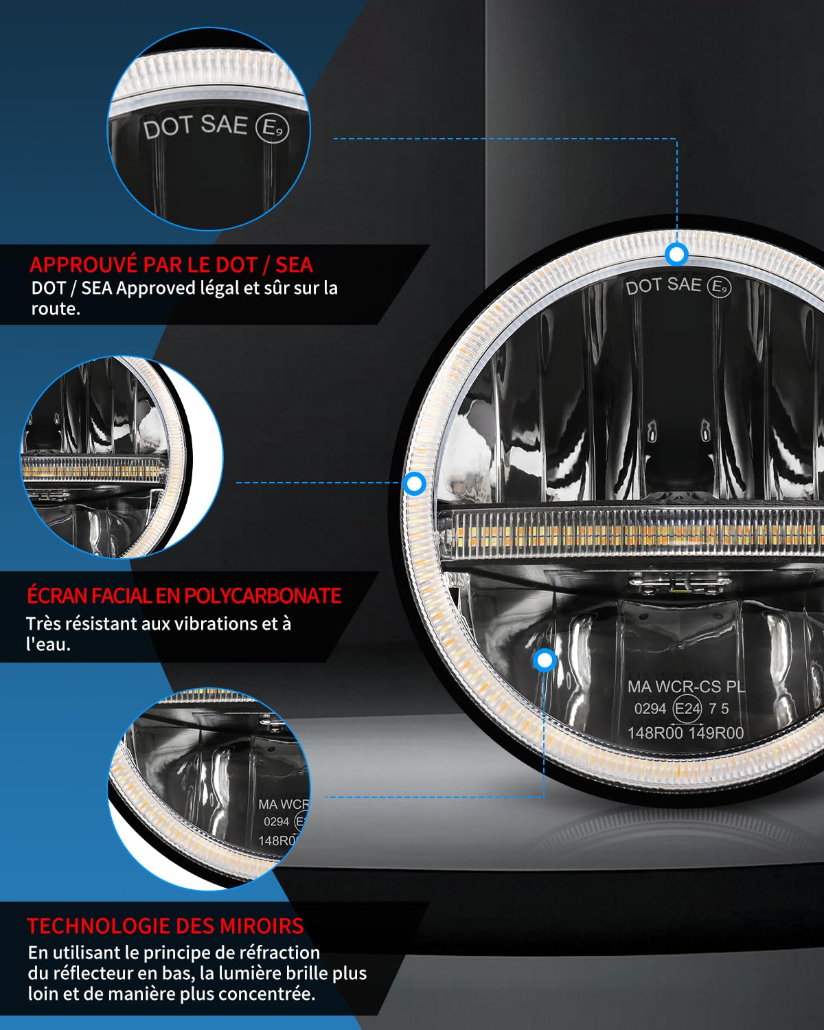 Support 24h/24 et 7j/7 via votre compte client, pour votre phare led moto BraveWAY. Phare De Travail Led BraveWAY 7 Pouces Phare Led Moto 15000LM, Led Phare Rond, Dot Approuvé Hi Lo Beam Blanc Ambré DRL, Avec Câble H4-H13, Compatible Wrangler JK TJ LJ CJ Hummber H1 H2 Phare Moto Anti éblouissement Feux de route 15000LM, feux de croisement 10000LM. Classé IP69K, il résiste aux intempéries extrêmes (neige, boue, pluie), avec une durée de vie de plus de 80 000 heures, parfait pour les trajets quotidiens et l... 🔧【Installation Facile Plug-and-Play】 Équipé d'adaptateurs H4-H13, ce phare moto led s'installe rapidement sur de nombreux modèles : Peu-geot Speedfight (2000-2018), Yama-ha MT-07 (2014-2023), Tri-umph Bon-neville T100 (2001-2023), KT-M 390 Du-ke (2013-2023), Hon-da Afri-ca Twin (2016-2019), ainsi que Wrangler JK/LJ/TJ/CJ et Hum-mer. 💡 【Anti-Buée & Réglable】 Ce phare moto 7 pouces dispose d'un système de ventilation unique qui évite la formation de buée. BraveWAY 2PCS Phare Led 7 Pouce Feu de Route/Feu de Croisement 6000K IP69K Certifié E-MARK Plug and Play Avec Câble H4-H13 Compatible avec Wrangler JK/TJ/CJ... Classé IP69K, il résiste aux intempéries extrêmes (neige, boue, pluie), avec une durée de vie de plus de 80 000 heures, parfait pour les trajets quotidiens et l'off-road. Émettant une lumière blanche froide de 6000K (6800LM feu de croisement, 8000LM feu de route), il pénètre facilement le brouillard et la pluie. Son faisceau uniforme élimine les zones d'ombre, et son réglage aisé garantit qu'il n'éblouit pas les autres usagers, idéal pour la conduite nocturne et les conditions météorologiques difficiles. BraveWAY 7 Pouces Phare LED Moto Rond 4 Modes Doté d'une technologie anti-éblouissement, il protège les autres conducteurs tout en améliorant votre visibilité, idéal comme remplacement des phares halogènes. Solutions anti-clignotement incluses pour les systèmes électriques complexes.