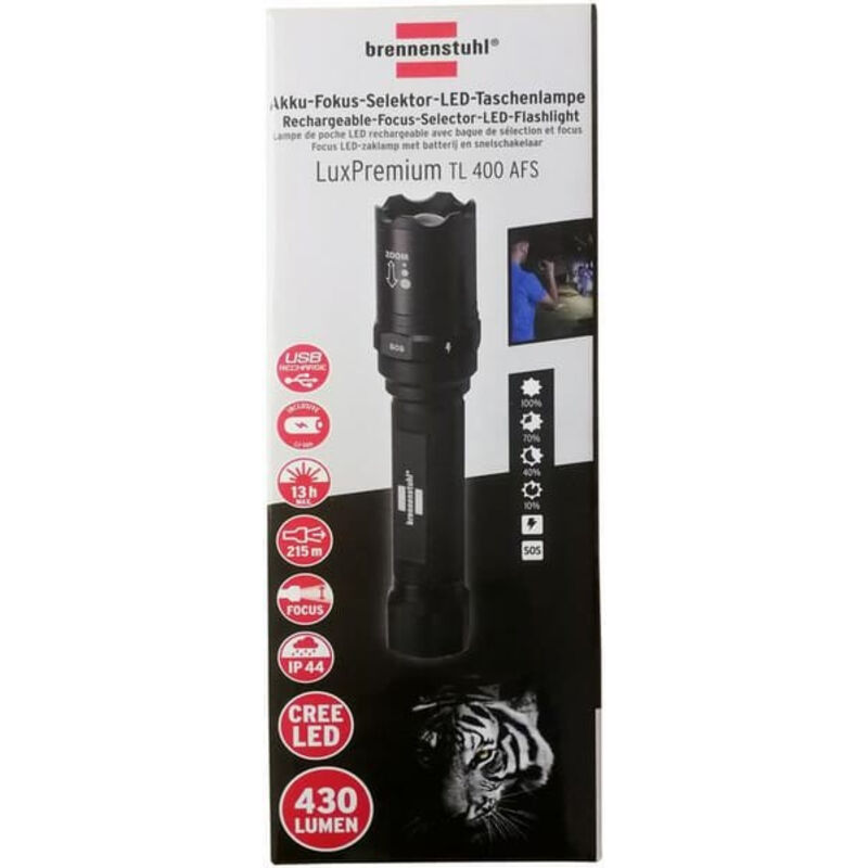 Brennenstuhl TL 601 Lampe de poche à piles LED 600 lm 160 g · Commander et payer via · Livraison offerte par Conrad.be · 30 jours de réflexion et retour... Lampe torche super lumineuse avec fonction de mise au point de haute qualité offrant de nombreuses fonctions : 100 % - 40 % - 10 % - SOS La lampe torche USB C permet une mise au point continue de la lumière de gros plan à la lumière longue distance focalisée – avec une portée lumineuse allant jusqu'à 190 m LED Avec Batterie Li-ion 2.6 Ah Brennenstuhl LuxPremium TL 601 AF/LED Rechargeable Par USB Avec Câble De Charge USB 600 Lm Max. 26 H Lampe Torche 26h * Temps de charge : environ 3h * Degré de protection (IP) : IP67 * Résistance aux chocs : IK07 * Classe de protection : III Lampe de poche LED avec une autonomie maximale de 26h et 600lm - idéale pour les activités de plein air comme le camping ou une excursion en extérieur, car elle se range facilement dans le sac à dos La lampe de poche Brennenstuhl est idéale pour les activités de plein air comme le camping, la randonnée ou la pêche et convainc également par les caractéristiques suivantes : * Flux lumineux total : 600 lm (mesuré selon ANSI FL1) * Température de couleur : 6500 K * Portée lumineuse : 190 m * Technologie de la batterie : Lithium-Ion * Tension : 3,7 V * Capacité de la batterie : 2,6 Ah * Durée d'éclairage max. Akku Taschenlampe LED LuxPremium TL 410 A, IP44, 400lm | brennenstuhl