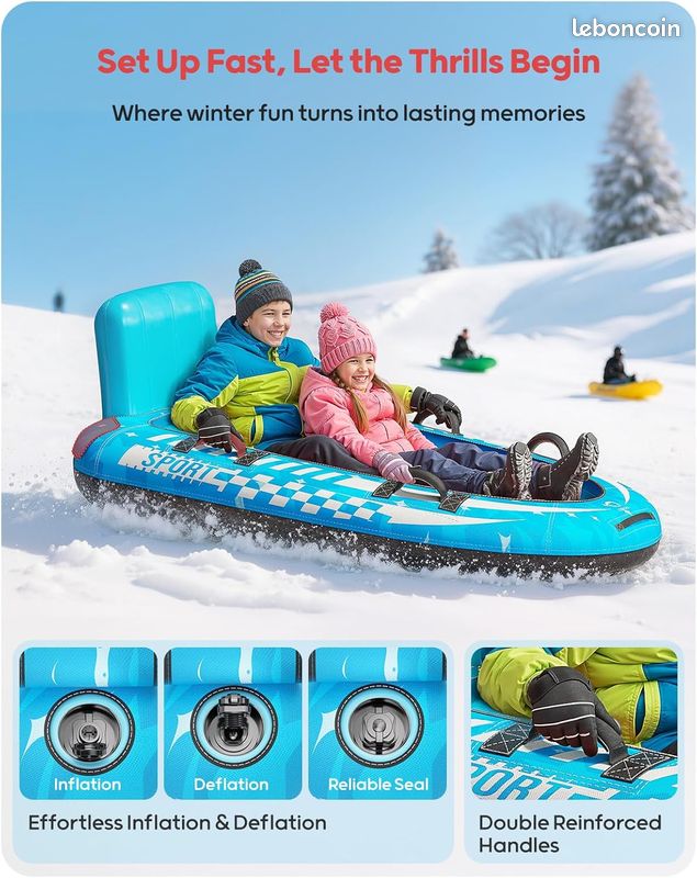 Le fond a des pistes antidérapantes qui améliorent la stabilité sur les collines glacées, vous donnant des promenades plus lisses et plus sûres à chaque fois. Luge à Neige Plastique Avec Corde pour Tirer Résistant Classique Cadeau de vacances d'hiver portable : se dégonfle de manière compacte pour un rangement et un transport faciles. Traîneau Pneumatique Capacité 227 Kg Briday - Snow Tube - Luge à Neige Gonflable Super Grand De 45 Pouces Pour Enfants Et Adultes Tube A Neige Gonflable Robuste Fabrique Avemateriau 22457 B Luge Avec Dossier Et Poignées Housse en toile durable et base antidérapante : fabriqué avec une doublure en PVC robuste et une housse en tissu robuste, ce jouet gonflable pour l'hiver résiste aux coupures et à l'abrasion de la neige et de la glace. Un tube à neige conçu pour durer pendant de nombreuses saisons. Luge à neige - MOTHINESSTO - Modèle avec corde à tirer - PEHD... Plus qu'un simple jouet de neige, c'est un cadeau de vacances attentionné qui rassemble les familles, créant des souvenirs d'hiver durables. Le design à double joint empêche les fuites, tandis que la jauge transparente incluse assure une installation parfaite. Mesurant 161,3 x 85,1 cm, cette luge gonflable surdimensionnée supporte jusqu'à 226,8 kg et s'adapte facilement à deux conducteurs Les parents peuvent remorquer confortablement leurs enfants, économisant de l'énergie pour des trajets plus amusants. Sangle de remorquage pour une traction sans effort : la corde de remorquage incluse avec poignée rembourrée la rend facile à transporter en montée ou sur la neige. Profitez des heures de plaisir sans souci avec l'un des meilleurs tubes à neige robustes pour la luge. Circuits plus sûrs avec dossier et poignées : contrairement aux tubes à neige ordinaires, cette luge à neige avec housse dispose d'un dossier de soutien et de poignées latérales renforcées pour une prise en main sûre. Léger mais durable, ce tube à neige QPAU s'adapte parfaitement dans un coffre de voiture et est toujours prêt pour la prochaine aventure enneigée.