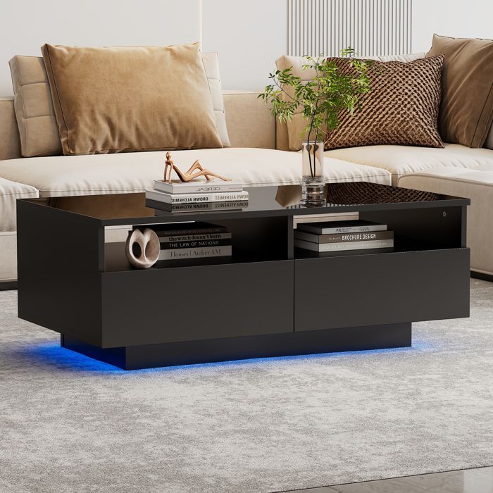 Table Basse Carrée - Table Basse Noire Avec 2 Tiroirs De Rangement Bordure Doree Pour Salon Et Bureau Avec une longueur de 1 005 039 cm, cette table compacte et spacieuse est idéale pour les espaces de vie modernes qui exigent élégance et fonctionnalité. Table Basse Salon Avec LED Table Basse Noire Brillante, Table De Canapé Carrée Avec éclairage LED Et 2 Tiroirs, Pour Salon Et Chambre 100x50x40 Cm 87572216 Table Moderne Basse Les tiroirs intégrés offrent non seulement un espace de rangement supplémentaire, mais protègent également votre vie privée. Table Basse Noire 2 Tiroirs Avec LED Via Appli - Éclairage Plateau - 100x50x35 Cm. SOLDES. STILVORA. Table Basse Noire 2 Tiroirs Avec LED Via A.. 208,99 € HT75... Table Basse Avec Lampe LED, Table Avec Tiroirs, Laque Haute Luminosité, Table D'appoint Avec Deux Étagères, Noir, 100 X 50 X 39cm ... -10€ dès 79€ d'achat, code... Matériaux de haute qualité: Cette table est faite de matériaux de panneaux de particules durables qui sont non seulement esthétiques, mais aussi stables et durables. Le noir brillant et brillant apporte une touche de luminosité à n'importe quelle pièce et donne une touche moderne à votre salon. Moderne et pratique: des lignes claires et des fonctionnalités raffinées font de cette table une déclaration de modernité et un complément pratique à votre maison. Ce meuble incarne la perfection de la forme et de la fonction. Deux étages, beaucoup d'espace: Cette table a deux étages pour mettre des tasses de café, des décorations et des livres, le tout à portée de main pour embellir votre salon. BTM Table Basse avec Lampe LED Découvrez l'élégance intemporelle avec notre table basse élégante.