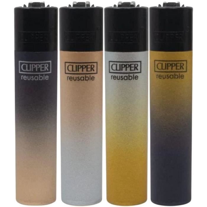 Pack économique de 48 briquets à pierre CLIPPER – Briquets CLIPPER... Lot de 4 briquets Clipper Briquets rechargeables avec du gaz ordinaire , Pierre remplaçable Lot 4 Briquets Métal Lot De 4 Briquets Clipper Gradient Effet Métal Gold/Grey Briquet Dégradé Or Gris Les briquets Clipper sont réutilisables, rechargeables et la pierre peut être remplacée Lot de 4 Briquets Clipper Gold Gradient avec quatre modèles différents plus un dégradé de deux couleurs sur chaque briquet : un briquet vert gold, un bleu gold, un briquet orange gold et un rose gold. Briquet Clipper classique grand format rechargeable avec du gaz ordinaire 4 modèles différents : 1 gris foncé vers un doré riche, 1 doré riche vers un gris clair, 1 gris clair vers un doré pâle et 1 doré pâle vers un gris foncé. Briquet Clipper Métal Dégradé Violet/Bleu | Iconic Gradient