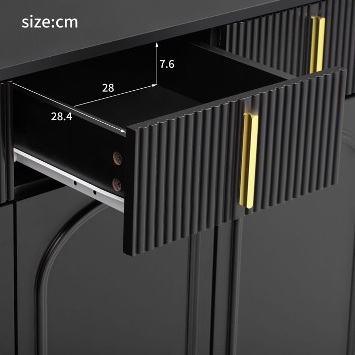 Buffet 4 portes bois massif et pieds en métal industriel Buffet quatre portes Tallulah – La Lune Meuble Rangement Salon Noir Buffet En Bois Massif 4 Portes Et Ses Portes Vitrées Pour Une Salle à Manger Cha Buffet 4 Portes Design Moderne Détails du produit : Dimensions hors tout (cm) : 160 L x 40 L x 80,5 H Charge du produit : 75kg Poids net :41kg Matériau : MDF Non brillant Autres outils requis : Oui Quantité d'emballage :2 (Peut ne pas être livré le même jour) ✅ 【Format compact 】Avec ses dimensions pratiques de 160 x 80,5 x 40 cm (L x H x P), ce meuble s’intègre facilement dans un coin du salon, de la salle à manger ou du couloir, sans encombrer tout en offrant un grand espace de rangement. Rangement modulable ]Doté de 4 portes et 2 étagères intérieures réglables en hauteur, ce meuble offre une grande flexibilité pour ranger livres, vaisselle... ✅ 【Design élégant et moderne】 Ce meuble de rangement allie un revêtement en MDF noir mat avec des poignées et pieds en métal doré, pour un look raffiné et contemporain. ✅ 【Entretien simplifié 】Grâce à ses surfaces lisses et matériaux de qualité, l’entretien est rapide : un simple coup d’éponge ou un chiffon humide suffit pour préserver son bel aspect longtemps. Fonctionnel et décoratif à la fois ✅【Usage polyvalent】Ce meuble convient aussi bien dans le salon, la salle à manger, l’entrée ou même la chambre.