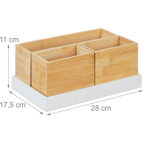 10 x 13 x 8 cm- Charge max. Relaxdays Organiseur de Bureau en Bambou, 4 Compartiments détachables, pour Votre Bureau ou Salle de Bain, Naturel : : Fournitures de bureauLes prix des articles vendus sur incluent la TVA. En fonction de votre adresse de livraison, la TVA peut varier au moment du paiement. Pour plus d’informations, Veuillez voir les détails. 11,30 € avec 49 % d'économies -49 u001130... Pratique : range-fournitures en lot de 4 pièces - Sans couvercle pour un accès facile au contenu 11 x 28 x 17,5 cm- Support H x L x P : env. Boîtes Compartiments Bambou Blanc Relaxdays Organisateur Bureau, 4 Tiroirs, Bambou & MDF, Rangement Pour Fournitures, HxLxP : 13 Organiseur Salon Salle De Bain - Pour les pinceaux de maquillage et autres accessoires- Lot pratique avec 3 boîtes de rangement & un support- Superbe design avec compartiments naturels et support blancContenu de livraison- 1x support- 1x grand compartiment- 2x petits compartiments- Livraison sans articles de décoration Cependant, c’est également un superbe rangement pour la salle de bain. - Rangement de fournitures de bureau comme des ciseaux, des règles, des notes, etc. Rangement : compartiments en bambou pour stylos, règles, etc. - Pour maquillage, cosmétiques, etc. Organiseur en bambou en détail- Dimensions totales H x L x P : env. 10 x 26,5 x 8 cm- 2x petites boîtes H x L x P : env. Organiseur de bureau 4 tiroirs Si vous souhaitez apporter plus d’ordre sur votre espace de travail, cet organiseur est le rangement idéal ! En effet, il offre un large espace de rangement, permettant de stocker des lettres, des notes, et autres fournitures. Cependant, il peut également être utilisé dans la salle de bain pour le rangement de cosmétiques, de bijoux, etc. Enfin, cet... Ainsi, vous gardez une bonne vue d’ensemble sur vos cosmétiques et vous les avez à tout moment à portée de main ! Détails : organiseur en bambou & MDF - Dimensions totales H x L x P : env., 11 x 28 x 17,5 cm Range Bijoux Bambou Organiseur Cosmétiques En Bambou Relaxdays - 4 Compartiments + Tiroir Pour Maquillage & Bijoux Organiseur Bureau Salle De Bain