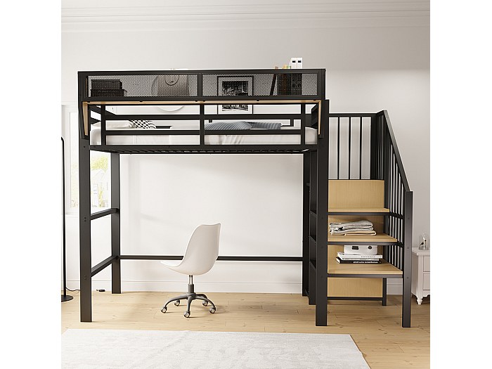 MOBETTRES Lit mezzanine 140 x 200 cm - Construction en métal robuste avec espace de rangement spacieux Aucun outil électrique n’est requis pour l’installation. Lit Métal Robuste 120 Kg Charge Lit Mezzanine 140x200cm Avec Bureau, Armoire, étagères De Rangement, Escalier Et Sommier, Métal+mdf, Noir, Sans Matelas Lit Avec échelle De Sécurité Grâce à son généreux espace de 140 cm en dessous, vous pouvez facilement y installer un canapé, un lit ou même une table. ÉCHELLE DE SÉCURITÉ INCLUSE : équipé d'une échelle sûre et facile à escalader, ce lit mezzanine offre un accès sécurisé à la zone de couchage surélevée pour tous les âges Lit mezzanine en métal 90x200 avec échelle de sécurité et compartiment... ÉTAGÈRE DE RANGEMENT FLEXIBLE : L'étagère réglable se monte et se démonte facilement selon vos besoins, offrant ainsi de multiples possibilités d'aménagement. LIT ROBUSTE ET DURABLE : Ce lit mezzanine, fabriqué en métal de haute qualité, garantit stabilité et sécurité, offrant un confort durable au quotidien. IDÉAL POUR LES PETITS ESPACES : Parfait pour les appartements, les dortoirs ou les chambres d'enfants, ce lit mezzanine exploite l'espace vertical pour créer de l'ordre et optimiser l'espace restreint. Doté d'une échelle de sécurité robuste et d'un compartiment de rangement modulable, ce lit allie confort et fonctionnalité. CONCEPTION PEU ENCOMBRANTE : Avec un espace libre de 140 cm sous le lit, vous créez un espace supplémentaire pour des meubles tels qu'un canapé, une table ou un autre lit, idéal pour optimiser les petits espaces. Optimisez votre espace de vie avec ce lit mezzanine robuste pour petits espaces.