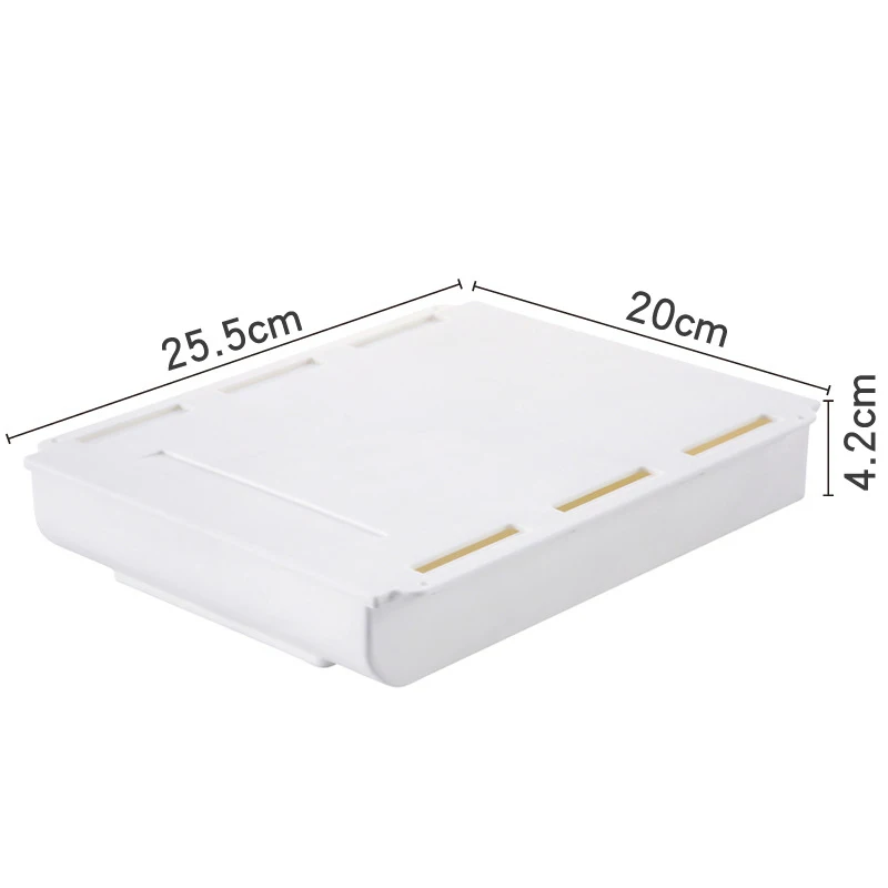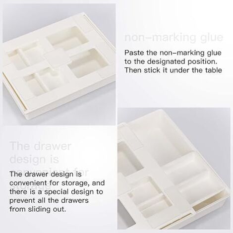Important : pour une adhérence optimale, le support doit être sec et lisse. Grâce au mécanisme de verrouillage robuste, vos affaires restent bien rangées. 【Utilisation universelle】Idéal pour les bureaux, les armoires de salon, les cuisines ou même le bureau - ce tiroir est polyvalent. 【Options de montage flexibles】Choisissez parmi deux méthodes de montage simples : utilisez le montage à vis stable ou le montage adhésif pratique. BOITE DE RANGEMENT,S-White--Plateau à crayons auto adhésif pour Table Après avoir appliqué le ruban, vous devez appuyer fermement pendant au moins 24 heures avant de mettre du poids. Gardez votre espace de travail propre et organisé efficacement ! Peut être placé sous les bureaux, armoires, armoires et autres endroits cachés. Placez-le sous la table, gardez la table propre et laissez la table suffisamment... Vous disposez ainsi d'un espace de travail bien rangé et peu encombrant. Ainsi, vous pouvez ranger de petits objets tels que des stylos, des adaptateurs ou d'autres accessoires de manière claire et toujours à portée de main. Un tiroir esthétique sous votre bureau qui offre à la fois fonctionnalité et élégance. Tiroir Coulissant Sous Bureau Zengest Tiroir De Bureau Auto-adhésif - Tiroirs De Bureau Suspendus Tiroir Sous Bureau Ikea Excellent gain de place]--Le tiroir sous bureau peut être caché sous la table, sans occuper de place sur la table ni même hors de votre vue, gardant vos... Le tiroir a une taille de 35,5 x 25 x 10 cm et peut supporter un poids allant jusqu'à 5 kg lorsqu'il est vissé.