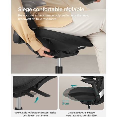La sécurité avant tout : La base en métal testée confère à cette chaise ergonomique une robustesse et une capacité de charge exceptionnelles, permettant de supporter jusqu’à 150 kg. Songmics fauteuil de bureau pas cher Réglable : La hauteur d’assise est ajustable sur 10 cm ; le support lombaire est réglable vers le haut et vers le bas, vers l’avant et vers l’arrière ; l’appui-tête est inclinable et réglable en hauteur ; les accoudoirs sont réglables en hauteur sur 7 cm Chaise Ergonomique Blanche SONGMICS Chaise De Bureau Ergonomique, Fauteuil De Bureau Appui Tete Et Soutien Lombaire Reglables Supporte Jusqua 150 Kg Hauteur Reglable Beige Sable Obn066lf01 89063288 Fauteuil Bureau Réglable Le tissu en maille double couche respirant, ainsi que le coussin d’assise bien rembourré assurent fraîcheur et soutien idéal, même après une longue période en position assise. Matériaux : Plastique, rembourrage en mousse, acier, tissu polyester, contreplaqué Ce fauteuil de bureau dispose d'une hauteur d'assise réglable de 46,5 à 56,5 cm, qui s'adapte à différentes tailles. Le dossier et les accoudoirs sont réglables... Montage facile : Grâce aux instructions illustrées et aux pièces numérotées, une seule personne peut assembler cette chaise gaming en 15 à 30 minutes Capacité de charge statique maximale : 150 kg Fauteuil de bureau ergonomique réglable : Ce modèle offre un dossier inclinable avec trois angles (95°, 115° et 130°) et est équipé d'un dossier et d'un appui-tête en toile respirante, pour un confort optimal lors du travail ou de l'étude Dimensions du dossier : 51,5 x 84 cm (L x H) Dimensions totales : 70 x 70 x (113-130) cm (P x L x H) Dossier ergonomique : Le dossier en forme de S épouse la courbe de votre corps et s’incline de 95° à 135°. La hauteur d’assise réglable, le soutien lombaire ajustable et l’appui-tête large de 40 cm vous offrent un confort d’assise optimal. Grand confort : Le tissu en maille double couche est résistant et respirant ; le coussin d’assise rembourré est élastique et soulage la pression sur vos hanches