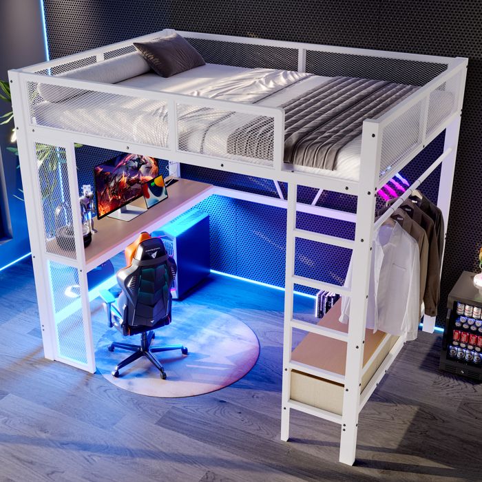 【Conception gain de place】:Sous le lit se trouvent un long bureau et trois tiroirs pour vos études ou vos objets du quotidien. Lit adulte 140x200 cm Lit avec USB Type C éclairage LED tête de lit... 【Éclairage LED】:La bande LED peut être placée sous le bureau ou sous le lit selon vos besoins, pour un confort optimal lors de vos soirées. ※ Ce produit sera divisé en 2 colis pour la livraison. Lit Gain De Place Chambre Lit Mezzanine 140x200 Cm - Avec Bureau Et Deux étagères, Barrière Lit Mezzanine Enfant La banquette au-dessus des tiroirs vous permet de vous reposer et peut également servir de rangement pour divers objets lorsque vous ne dormez pas. Ce lit mezzanine en métal, équipé d'un bureau, d'étagères et d'une échelle, est un modèle simple et élégant qui s'harmonise avec de nombreux styles de décoration et vous permet d'embellir votre chambre. Ce lit optimise l'espace et permet un gain de place considérable, idéal pour les petits espaces. Vous pouvez choisir parmi 16 couleurs grâce à la télécommande. 【Montage facile】:Toutes les pièces incluses dans votre colis sont clairement étiquetées. Sa structure robuste en métal et en bois, ainsi que ses lattes métalliques stables, lui confèrent une grande durabilité. Ils peuvent ne pas arriver en même temps., Veuillez patienter. Le plan de travail sous le lit est équipé d'une prise USB et d'un port USB-C, permettant de recharger téléphones, tablettes et autres appareils sans chercher une prise murale, pour plus de confort pendant les périodes d'étude ou de loisirs Doté de bandes lumineuses LED, il apporte non seulement du confort, mais crée également différentes ambiances grâce à ses couleurs variées. Grâce aux instructions de montage étape par étape et aux trous pré-percés, vous pourrez facilement assembler ce lit selon vos préférences. Lit Mezzanine Enfant 140x200 Avec 4 étagères De Rangement Et Bureau Sommier A Lattes Et Echelle Inclus Bois De Pin Et Mdf Gris