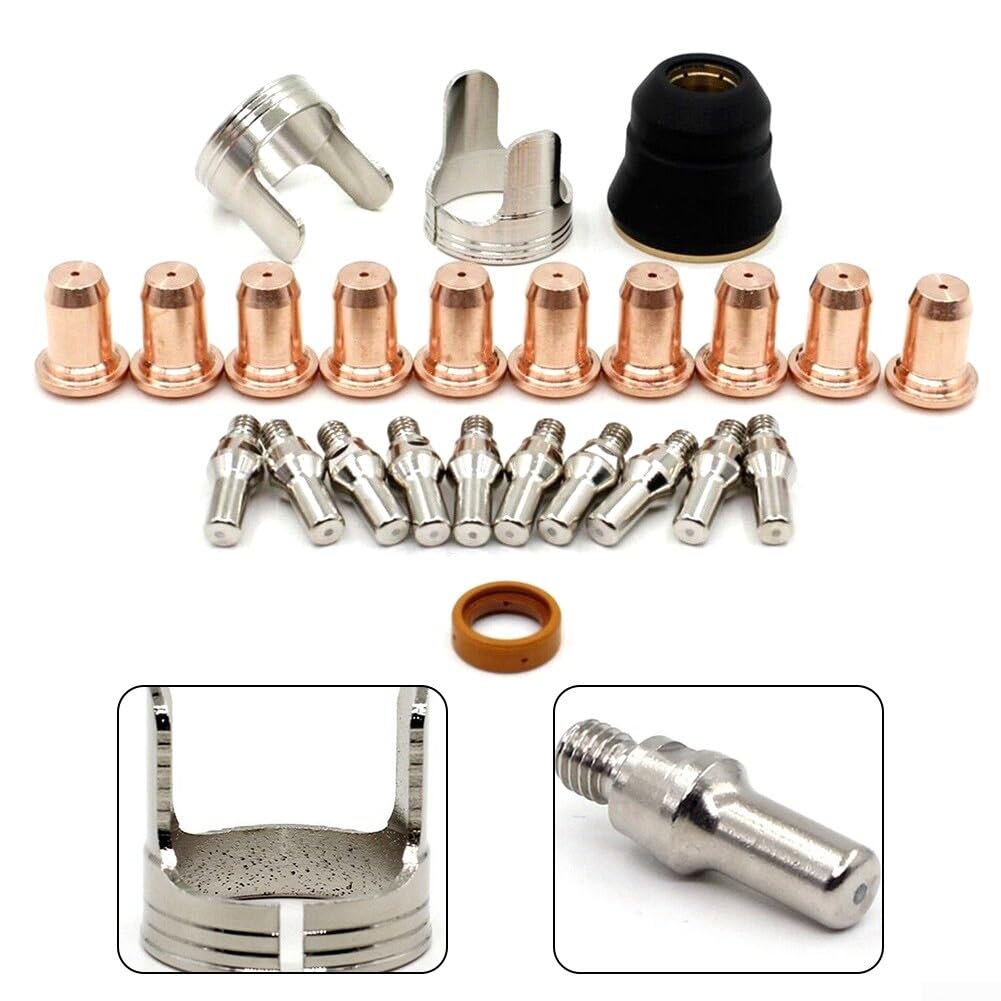 20 électrodes PT-60 -40 PT40, Buse 52582, Compatible Avec Les Consommables Pour Torche De Decoupe Plasma Diametre De Buse 11 Mm 60 A~p179801252 Lot de 25 embouts de coupe pour électrodes, accessoires consommables... électrodes Cuivre Torche Plasma MYG 20pcs Électrode à Plasma MT52582 Embouts Buses MT51313P1.1 Pour Torche De Coupe PT60 Consommables Torche Plasma PT60 Ce kit de 20 consommables pour torche plasma comprend 10 électrodes MT52582 et 10 buses MT51313P1.1 et est conçu pour les torches PT60 et coupantes. Les matériaux de haute qualité sont fabriqués pour être pratiques et des performances constantes Solution économique : faites le plein de ce lot de 20 consommables essentiels (10 électrodes + 10 buses), réduisant les temps d'arrêt et gardant votre coupe-plasma en fonctionnement à un rendement maximal. Ajustement parfait : fabriquées selon des spécifications exactes avec une ouverture de buse de 1,1 mm, ces pièces de rechange offrent une formation optimale d'arc plasma et une précision de coupe pour votre système de torche PT60., Qualité testée : chaque composant est rigoureusement testé selon des normes strictes de contrôle de qualité pour garantir une performance fiable, une stabilité d'arc constant et une durée de vie prolongée pour des résultats professionnels.