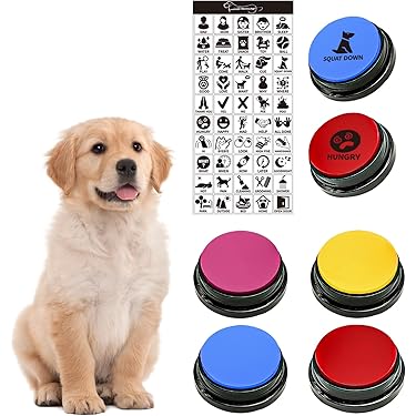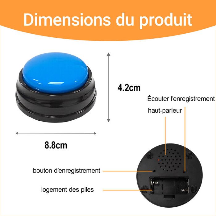 Spécification: ●Matériau : plastique ABS ●Couleur : rouge, jaune, bleu, vert ●Sexe : unisexe ●Batterie : 2 x AAA (non incluses) ●Poids du colis : environ 340 grammes Le forfait comprend: 8 x Buzzer Enregistrable Mode d'emploi NO Avertissement De Sûreté NO Lot de 8 boutons d'enregistrement vocal, buzzer de ces boutons de dressage pour chien offrent beaucoup de divertissement et d'interaction inattendus. Lot 8 Boutons Communication Chien Buzzers De Dressage Enregistrables - Lot De 4 Boutons De Dressage Pour Chien Et Chiot - Entraînez Facilement Votre Chien à Appuyer Sur Les Boutons Et à Exprimer Ce Qu'il Veut Boutons Interactifs Animaux ●Buzzer Enregistrable de compagnie comme aide au dressage des chiots, les animaux peuvent être mieux entraînés à développer de bonnes habitudes. 【Matériau de Haute Qualité】Le Buzzer Enregistrable est fabriqué en matériau ABS de haute qualité, sûr et fiable, durable et pas facile à endommager, longue durée de vie. Jouet pour chien - Buzzer avec boutons enregistrables - 8 boutons pour la communication canine - Fonction d'enregistrement - Bouton vocal - Buzzer de 30... Les Buzzer Enregistrable de compagnie vous permettent d'interagir avec le chien et même d'exprimer quelques pensées simples, ce qui est très intéressant. 【Facile à utiliser】Maintenez le bouton d'enregistrement enfoncé, démarrez l'enregistrement lorsque vous entendez le bip, relâchez-le lorsque vous entendez le bip et l'enregistrement est terminé. Boutons de communication pour chien: Notre bouton de dressage pour animaux de compagnie apprend à votre animal de compagnie bien-aimé à exprimer ce qu'il veut faire dans la bonne scène en enregistrant le son des commandes et en guidant votre animal pour qu'il prenne les actions correspondantes Les Buzzer Enregistrable pour chien permettent un enregistrement clair, réglez le bouton d'enregistrement pour enregistrer le son souhaité. 【Fonction d'enregistrement】le bouton d'enregistrement peut enregistrer jusqu'à 30 secondes. Buzzer Enregistrable pouvez également ajouter des mots simples pour interagir avec le chien, comme jouer avec moi, sortir, boire de l'eau. Notre bouton de communication pour chien enregistre les sons clairement. Ces cloches d'entraînement pour animaux de compagnie sont petites et suffisamment légères pour être transportées.