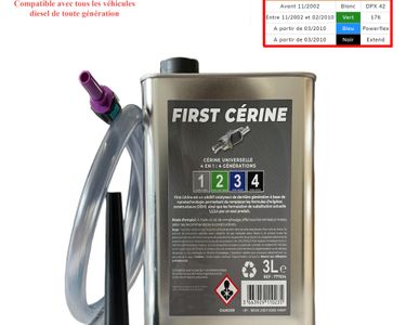 Entretien FAP Voiture Diesel Additif DPF FAP Cérine Powerflex BLEU 1L C3 C4 Cactus C8 DS3 DS4 DS5 Additif Fap Universel 1L First Fap Cérine Additif FAP Bleu kit de remplissage Warm Up Combutec 3 1 Litres - Auto Additif Cérine Universelle 3L pour Filtre à Particules – Avec Kit de... KIT DE REMPLISSAGE INCLUS Livré avec un kit complet de remplissage, ce produit offre une utilisation pratique et précise, sans nécessiter d'équipement supplémentaire. MAINTENANCE PRÉVENTIVE Idéal pour un entretien régulier, la Cérine Universelle First FAP aide à maintenir la fonctionnalité et l'état optimal des filtres à particules pour une durabilité accrue. ÉTAPES D'INSTALLATION Assurez-vous que le moteur est éteint et refroidi. BOOSTEZ LA PERFORMANCE DE VOTRE DIESEL La Cérine Universelle First FAP, proposée en 1 litre, est conçue pour s'adapter à tous les véhicules diesel équipés de filtres à particules (FAP). Utilisez le kit de remplissage fourni. Suivez attentivement les instructions pour verser la cérine universelle dans le réservoir d'additif du FAP. Utilisez la valise de diagnostic pour réinitialiser le calculateur du FAP afin de valider le remplissage et d'effacer les codes d'erreur. Réduisez les émissions d'oxydes d'azote de votre véhicule diesel tout en optimisant la régénération de son fap en utilisant la cérine universelle Bardahl