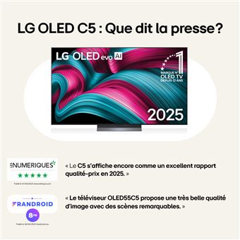 Lg 55c5 Prix TV LG Evo AI C5 (2025) 55" OLED UHD 4K - OLED55C56LB Lg 55 Oled Best Buy TV OLED evo AI C5 164cm (65) LG OLED65C56L, Smart TV 4K - LG - El Corte Inglés Pantalla 55 puadas AI OLED evo C5E 4K Smart TV 2025 - OLED55C5ESA... Il reconnaît les visages et offre une qualité 4K exceptionnelle, avec une expression faciale et une profondeur améliorées. Comparé à l'alpha 7 Gen8, les performances sont supérieures : 1,7× plus de capacité dans la NPU, 1,7× plus de vitesse dans la CPU et 2,1× de meilleurs graphiques dans la GPU. Dans des scènes comme un va-et-vient spatial, où la moitié est nette et lumineuse, vous ressentez toute la différence dans la qualité visuelle, semblable à ce que nous voyons dans la réalité. À propos de la TV LG evo AI C5 (2025) 55 OLED UHD 4K Détails visuels de pointe avec le processeur alpha 9 AI Gen8 Le processeur alpha 9 AI Gen8 analyse et améliore chaque image en temps réel. Teintes sombres parfaites dans n'importe quel environnement Testées et vérifiées par UL, les 'Teintes Sombres Parfaites' garantissent des noirs absolus (≤ 0,24 nit jusqu'à 500 lux). Couleurs réelles avec certification totale Avec 100% de volume et de fidélité des couleurs, certifiées par UL et Intertek, les couleurs restent vibrantes et précises dans toutes les conditions d'éclairage. Cela donne des images avec plus de clarté, de détail et d'impact visuel. Discover the 55 inch Class OLED evo AI C5 4K Smart TV 2025 that features Bright Room Ready performs great no matter the room or the lighting and Alpha 9 AI Processor Gen8 provides smooth, crisp picture and sound with AI Picture Pro and AI Super Upscaling. Find reviews, specs, and more for OLED55C5AUA.AUS