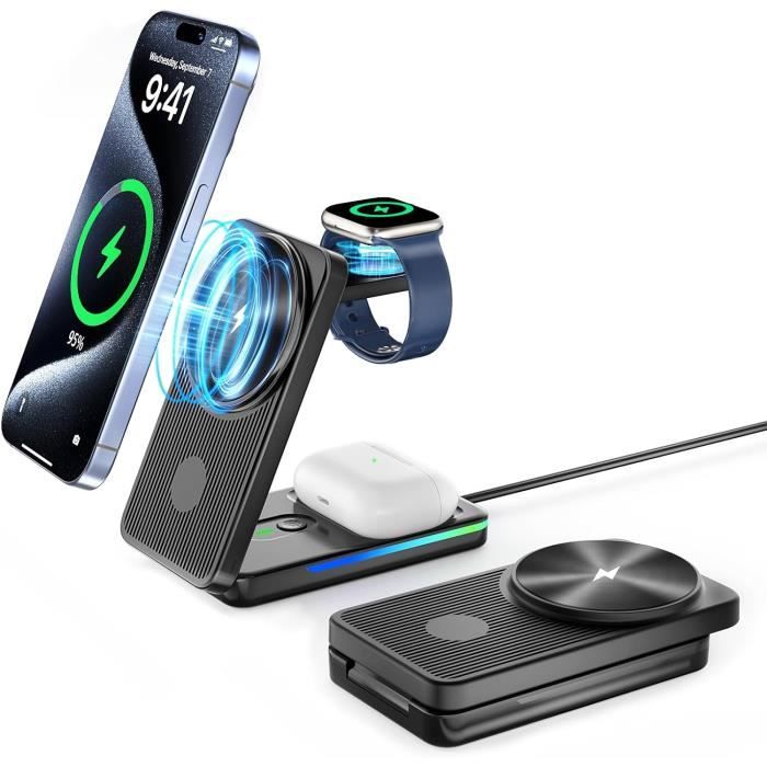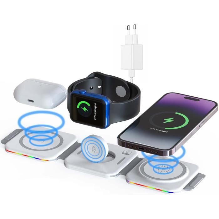 Le chipset intelligent intégré offre une protection contre les surcharges, les surtensions et la surchauffe. Charge Rapide Inductive CABLING® Chargeur Sans Fil Magnétique Mag-Safe Et Adaptateur USB-C 20 W Blanc Compatible IPhone 12, 13, 13 Pro, 14 Et 14 Pro - Téléphonie Câble 1,5 M Chargeur sans fil magnétique Mag-Safe, chargeur USB C 15 W pour iPhone, charge inductive, chargeur magnétique sans fil USB C compatible avec les séries iPhone 16/15/14/13/12, câble de 1,5 m de long Le chargeur MagSafe est la solution officielle d'Apple pour la recharge sans fil magnétique. Grâce à un système d'aimants intégrés, il assure un positionnement parfait sur l'iPhone, permettant une charge plus rapide et plus efficace que les chargeurs Qi classiques Entrée USB-C et câble de charge de 1,5 m : Le chargeur magnétique pour iPhone dispose d'un câble de charge intégré de 1,5 m. Remarque : si vous avez besoin d'une vitesse de charge maximale de 15 W, nous vous recommandons d'utiliser un adaptateur secteur de 18 W ou plus (adaptateur non inclus avec le produit). Chargeur sans fil pour 15 W, chargeur rapide compatible avec Mag-Safe pour iPhone, chargeur magnétique vers USB-C pour iPhone 15/15 Pro/15 Pro Max/14/16/13... Le chargement sans fil rapide et pratique protège votre iPhone Chargeur rapide portable Mag-Safe 15 W : charge complètement l'iPhone 15 en 2 heures et 50 % en une demi-heure. Alignement magnétique et forte adsorption : que vous travailliez, jouiez à des jeux, regardiez des films, écoutiez de la musique ou discutiez simplement, le chargeur magnétique sans fil aligne automatiquement le chargeur de téléphone magnétique à la position optimale et maintient votre iPhone en toute sécurité. 3 In 1 Mag Safe Chargeur Station, Mag Safe Chargeur Pour Apple Chargeur Tenez fermement votre iPhone pendant le chargement pour éviter qu'il ne tombe. Protection intelligente sûre et fiable : la station de charge magnétique utilise des isolateurs magnétiques professionnels, sans rayonnement et a passé les certifications FCC et RoHS pour vous offrir une protection.