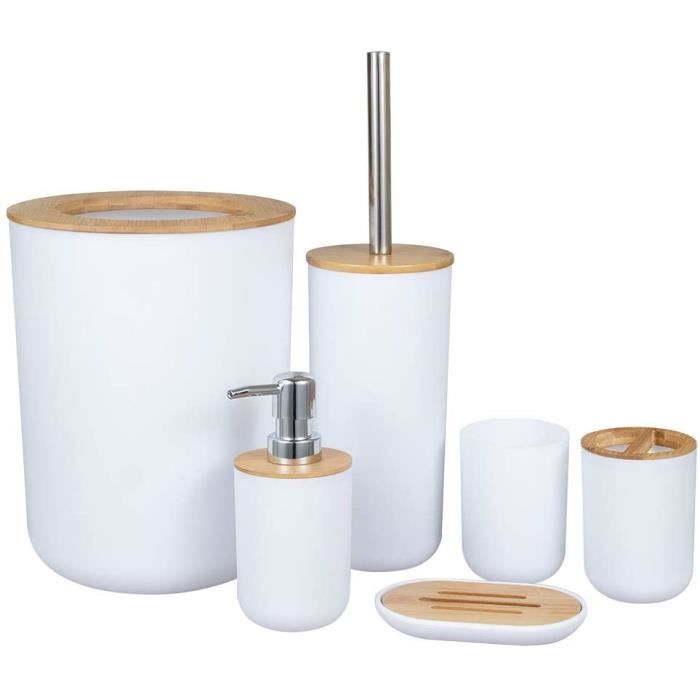 Matériau : bambou + polypropylène. Lot de 2 pack de 4 accessoires salle de bain, set salle de bain avec Il est rechargeable et respectueux de l'environnement. Porte Brosse à Dents Bambou CAC SENEGAL | Set De 6 Accessoires De Salle De Bain - Vert Accessoires Salle De Bain Naturel Style simple et généreux adapté pour les familles et les hôtels, B&B et autres scènes, facile à nettoyer, pratique et beau, ajoutant une chaleur naturelle à la salle de bain Caractéristiques du produit : Quantité : 6 pièces., Couleur : blanc. Dimensions : poubelle 19,5 x 19,5 x 24,5 cm, support de brosse à dents 12 x 7,8 x 10 cm, gobelet 7,5 x 7,5 x 10,5 cm, brosse WC 10 x 10 x 37 cm, distributeur de savon 7,5 x 7,5 x 16,5 cm, porte-savon 13 x 8,5 x 2,5 cm. Optima Hombre Set salle de bain avec Porte-brosse à dents... Multifonction : le design simple et généreux de l'ensemble de bain est non seulement adapté pour un usage domestique, mais peut également être parfaitement intégré dans les hôtels, les centres de villégiature et d'autres scénarios pour améliorer la qualité de l'espace Facile à nettoyer : la surface de l'ensemble de salle de bain est lisse et facile à nettoyer, il suffit de l'essuyer avec un chiffon humide ou de le rincer à l'eau, puis il aura l'air neuf, ce qui permet d'économiser du temps et des efforts Matériaux : Bambou naturel et plastique polypropylène; Résistance : Humidité, rouille et corrosion; Facilité d'entretien : Faciles à nettoyer ; Distributeur de... Matériau de haute qualité : l'ensemble d'accessoires de toilette est fabriqué en polypropylène de haute qualité combiné avec du bois de bambou naturel, qui est imperméable, résistant à la moisissure, résistant à l'humidité et durable, et peut facilement faire face aux environnements humides, et est construit avec un savoir-faire fin et une durabilité Conseils : Si vous avez d'autres exigences ou questions sur nos produits, n'hésitez pas à nous contacter. Le distributeur de savon est adapté pour le savon de cuisine, le détergent, le maquillage, l'après-shampooing, etc. Présentation du produit : Cet ensemble de 6 pièces de salle de bain minimaliste naturel comprend une tasse de bain de bouche, un porte-brosse à dents, une poubelle avec couvercle, une brosse de toilette, un porte-savon et un distributeur de savon, qui est fabriqué en polypropylène de haute qualité et en bois de bambou, qui est imperméable, résistant à la moisissure, résistant à l'humidité et durable. Le support de brosse à dents peut contenir différentes tailles de brosses à dents et de dentifrice, et peut également stocker des stylos et d'autres petits objets.