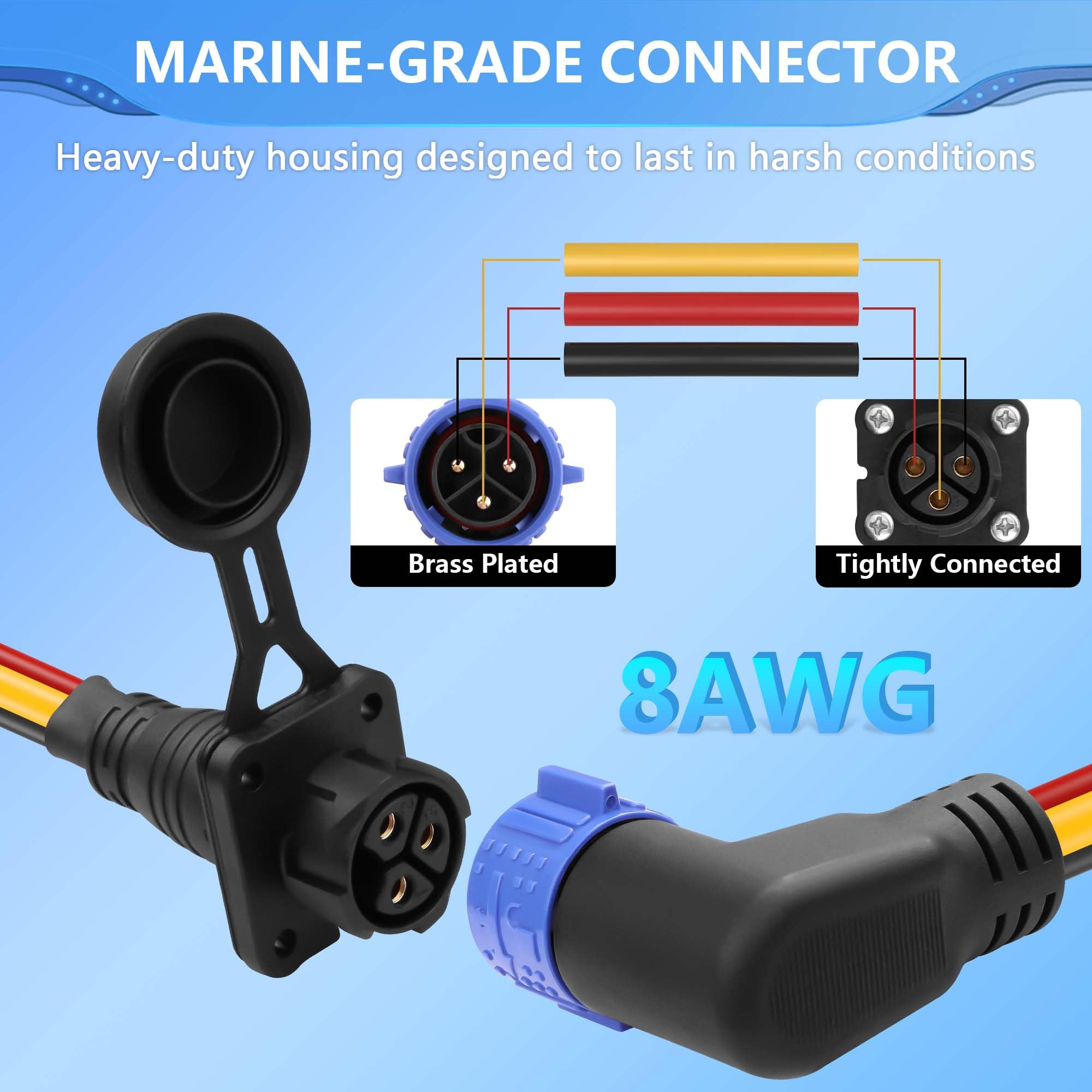 Prise Traîne Mâle Femelle 90° 8AWG 50A CERRXIAN Connecteur SCOT Pour Oteur à La Traîne - Kit De Connexion Rapide - 2 Broches - 12/24 Ensemble Prise Mâle Femelle étanche Disjoncteur avec porte-fusible à réinitialisation manuelle 300A DC12-48V disjoncteur de voiture... CERRXIAN Prise de connecteur d'alimentation CC, Adaptateur de Il suffit de tourner le verrou pour retirer la prise 12 volts, prise de raccordement femelle pour moteur à la traîne ,fil de 6 de long avec raccordement tubulaire, conception de caoutchouc noir moulé offre une... Connecteur de moteur à la traîne étanche IP67, design autobloquant qui maintient le moteur à la traîne et la source d'alimentation serrés, équipé d'un couvercle anti-poussière pour empêcher la poussière et l'eau de pénétrer lorsque vous ne vous en servez pas, prolongeant sa durée de vie et assurant une utilisation sûre Indice continu de 50 A ; câble entièrement en cuivre 8 AWG ; conception double étanche ; performance étanche IP67 ; prise de moteur à la traîne avec couvercle d'étanchéité étanche L'ensemble de prises et de douilles pour moteur à la traîne robuste dispose d'un fil de cuivre de qualité marine de 8 AWG et prend en charge un indice continu de 50 A pour une utilisation continue dans des conditions marines difficiles, idéal pour les moteurs à la traîne à courant élevé, les élévateurs électriques, les moulinets de pêche en chute profonde et plus d'équipements d'alimentation CC. Ensemble de 3 prises et prises pour moteur de pêche à la traîne, connecteur d'alimentation cc pour bateau marin 12V/24V/ 36V/48V