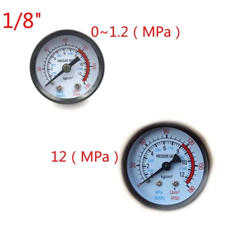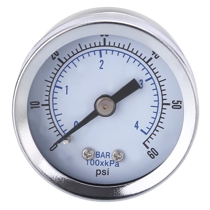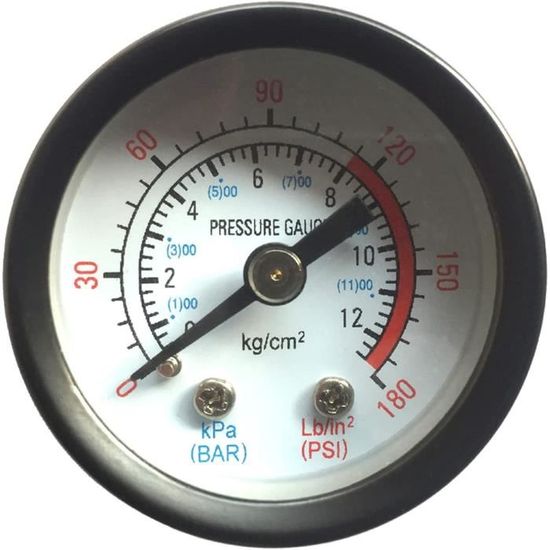 Manomètre, manomètre Mini manomètre pour carburant air-huile eau 0-160 Dispose d'un grand cadran facile à lire, mesure la pression de l'air de 0 à 180 PSI (0 à 12 bar). Accessoire Pneumatique Mesure Précise LECTURE PRÉCISE JAUGE De Compresseur D'air 0 180 PSI 0 12 Bar Diamètre Manomètre Compresseur Air Diamètre du filetage : environ 13 mm. Affichez une impression précise en temps réel, des performances stables et une fiabilité élevée. La jauge facile à installer et à utiliser est un accessoire... Manomètre : dispose d'un cadran de 50 mm de large pour une lecture facile avec des marquages clairs de 0 à 180 PSI et 0 à 12 bar pour une pression d'air... Construction en fer durable : construit avec une coque en fer robuste qui résiste aux vibrations de l'atelier et aux chocs accidentels, offrant un service fiable grâce à une utilisation répétée dans des environnements exigeants Filetage mâle inférieur pour une connexion fiable. Mesure à double échelle : pression dans les unités PSI et Bar simultanément, éliminant les calculs de conversion et ce qui le rend adapté à diverses applications, du gonflage des pneus à l'entretien des outils pneumatiques Plage de pression : 0 ~ 180 psi, 0 ~ 12 bar. Affichage facile à lire : dispose d'un grand cadran de 50 mm avec des marquages clairs et un design argenté sur noir, offrant une visibilité même dans des conditions d'atelier de faible luminosité pour des contrôles rapides de pression Nom du produit : jauge de compresseur.
