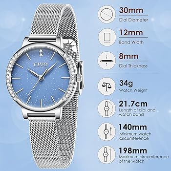★ Montre en Maille D'acier Inoxydable Douce pour la Peau ★: La sangle en maille est confortable à porter et la boucle de crochet avec un design de sécurité rend difficile pour la montre pour femme de glisser. ★ Montre élégante pour femme ★: La montre en maille argentée pour femme, spécialement conçue avec une surface de ciel étoilé bleu et de beaux strass autour du boîtier pour l'embellissement, est le meilleur accessoire pour montrer l'élégance et la mode des femmes. Montre Femme CIVO Ciel étoilé CIVO Montre Femme Analogique Quartz Acier Inoxydable Étanche Montre étanche 30m Maille Ajustable BO Montre homme quartz ciel étoilé très mince lumineux date bracelet en... La montre femme CIVO sera le cadeau parfait pour vous et vos amis Fonctions : Chronométrage précis et précis : fabriquée en matériau de haute qualité pour garantir un affichage précis de l'heure, cette montre pour femme peut fonctionner pendant une longue période., ★2., Design élégant : bracelet en caoutchouc de haute qualité, cadran rond simple et élégant, élégant et à la mode, c'est un cadeau parfait pour les femmes., ★3., Imperméable au quotidien : vous pouvez le porter lorsque vous vous lavez les mains et le visage. Contenu du paquet : 1 montre CIVO pour femme. ★ Ce Que Yous Obtenez ★: Montre femme CIVO, manuels d'instructions pour cette montre pour femme et ajustement du bracelet de montre, un outil pour l'ajustement de la longueur du bracelet, garantie de 12 mois et garantie de remboursement complet de 90 jours, service à la clientèle toujours amical et efficace ★ Mouvement à Quartz Durable et Batterie ★: Mouvement à quartz japonais avec affichage analogique. Cependant, il n'est pas recommandé de plonger et n'appuyez pas sur un bouton sous l'eau et l'eau chaude car cela raccourcira la durée de vie de la montre., ★ 4., Pointeur lumineux : absorbe l'énergie de la lumière pendant la journée et les chiffres peuvent être lus facilement la nuit. La montre en maille d'acier inoxydable ne se décolore pas et dure longtemps, et la longueur du bracelet peut être ajustée librement Largeur du bracelet : 16 mm Longueur du bracelet : 21,5 cm. Montre élégante pour femme ★: La montre en maille argentée pour femme, spécialement conçue avec une surface de ciel étoilé bleu et de beaux strass autour du boîtier pour l'embellissement, est le meilleur accessoire pour montrer l'élégance et la mode des femmes Construit dans une batterie japonaise de qualité, cette montre femme offrira une utilisation à long terme sans les tracas de changer les piles Résistance générale à la transpiration et aux éclaboussures accidentelles, mais pas à la douche ou à la natation. Caractéristiques : Couleur du cadran : blanc/bleu/violet Couleur du bracelet : noir/bleu/violet Diamètre du cadran : 35 mm. BO Montre homme quartz ciel étoilé très mince lumineux date bracelet en