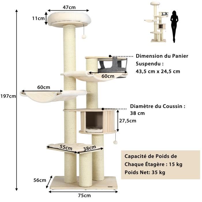 COSTWAY Arbre à Chat En Bois 191CM Avec Hamac, Panier, Perchoir Et Niche Tour A Chat Avec Coussin Amovible Et Poteaux A Gratter 4638648191 L Améliorez le Temps de Jeu et de Détente de Votre Chat ! Notre arbre à chat en bois de luxe mesure 58 x 152 cm (Dia. x H) et propose 6 niveaux pour que les... Arbre à Chat Grand Stable COSTWAY 163 CM Avec 3 Plateformes, 2 Niches, 3 Arbre à Chat En Bois De plus, il comporte patins antidérapants pour la protection du sol et de coins arrondis pour une sécurité accrue. 【Divertissements Engagés】L'arbre à chat inclut 4 poteaux à griffer entièrement enveloppés de sisal naturel résistant aux griffures et à l'usure, parfait pour l'affûtage des griffes. COSTWAY Arbre à Chat XXL 151 cm, Arbre a Chat Bois à 6 Étages, Tour... 【Multiples Espaces de Repos】La arbre a chat design comprend 2 grands condos à différentes hauteurs pour des siestes privées, un panier confortable offrant à votre chat une sensation de cocooning, et un grand perchoir avec un épais rembourrage pour se détendre et observer. Un amusement supplémentaire est assuré avec une pompon suspendue équipée d'une cloche, pour des heures de jeu de frappe et de bondissement. De même, le coussin du perchoir est à la fois amovible et lavable, favorisant un environnement propre et sain. 【Expérience de Repos Confortable】Les condos sont doublés d'un intérieur en bambou frais et d'un extérieur en tapis à griffer en sisal pour le divertissement et l'entretien des griffes.