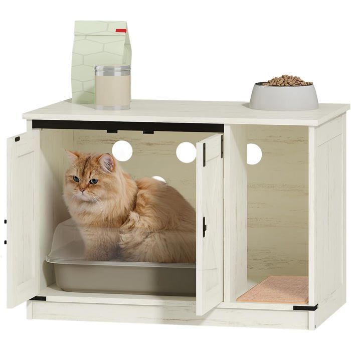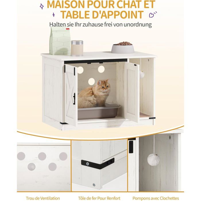 Construction Solide et Durable : Conçu pour durer, ce meuble litiere chat robuste et stable assure une utilisation sans souci au quotidien, faisant de cette maison de toilette chat un investissement serein pour tout propriétaire de chat. Meuble Litière Chat Cachée Meuble à Litière à 2 Niveaux 60 X 53 X 90 CM Maison De Toilette Pour Chat Avec Plusieurs Events Et Trou D Entree Cafe Maison De Toilette Chat Design Matériau et Conception : Fabriqué en panneaux de particules robustes, ce meuble litiere chat assure une stabilité et une durabilité optimales pour un usage quotidien avec vos animaux de compagnie. Maison de Toilette Chat, Meuble de Litière Pour Chat avec Tapis de Collecte de Sable, avec Plateau de Rangement, 120x50x66cm, Noyer · Les produits alternatifs Ce meuble litiere chat est vendu seul ; les accessoires présentés sur les photos le sont à titre d'illustration pour vous aider à imaginer l'installation finale de votre nouvelle maison de toilette chat. Conception à Double Porte & Anti-Propage : Ce meuble litiere chat avec son système à deux portes facilite l'accès et le nettoyage, tandis que son tapis intégré retient efficacement la litiere chat, faisant de cette maison de toilette chat une solution propre et pratique. Tucker Murphy Pet™ Meuble de litière pour chat, armoire à litière... Avis Important : Pour éviter tout doute, veuillez noter que les bacs à litiere chat ne sont PAS inclus dans le colis. Capacité de Charge : Plan de travail : Supporte une charge maximale de 25 kg. Intégration Parfaite dans l'Espace de Vie : Ne cherchez plus où cacher la litiere chat ! Maison de toilette pour chat - cache-litière avec doubles portes blanc Tablettes de rangement : Chaque tablette a une capacité de charge de 20 kg. Ce meuble litiere chat se transforme en une élégante console pour votre salon, une maison de toilette chat ingénieuse qui allie fonctionnalité et esthétique.