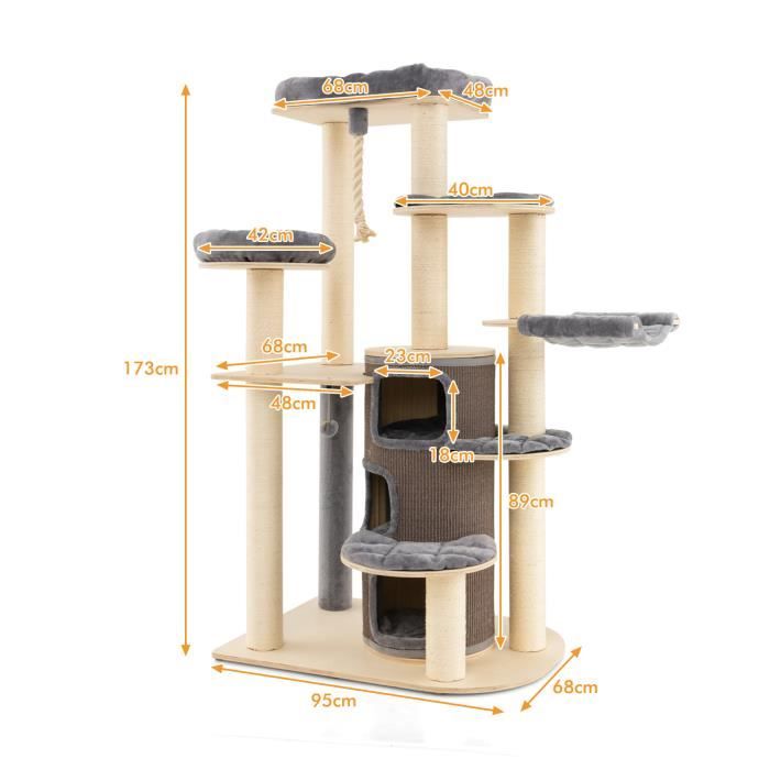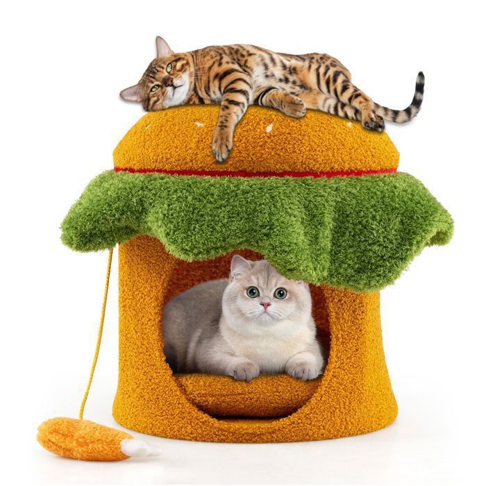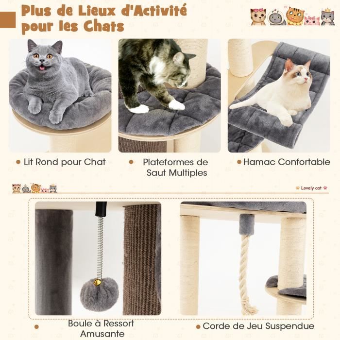Meuble Litiere COSTWAY Arbre à Chat 167 CM, Tour à Chat à Plusieurs Niveaux, Boule à Arbre A Chat Xxl Design COSTWAY Arbre à Chat en Bois Massif 174CM - Condo, Hamac - Tour à Chat COSTWAY Arbre à Chat 110CM Tour de Jeux pour Chat - Condo, Pompons... Il répond aux besoins variés de votre chat tout en ajoutant une touche ludique à votre décoration intérieure. Un espace de repos avec de décorations rembourrées en forme de fleurs offre un espace de repos privé et sécurisé. 【Centre de Divertissement】L'arbre a chat comprend 5 griffoirs recouverts de sisal naturel résistant aux griffes et à l'usure, idéal pour faire ses griffes. 【Design Créatif】Cet arbre à chat inspiré d'un hamburger présente une variété de couleurs vives et de décorations ludiques, notamment un pain à hamburger, une cuisse de poulet et des légumes-feuilles. 2 grandes plateformes permettent aux chats de s'étirer ou d'observer leur territoire, tout en ajoutant une touche ludique aux jeux de votre compagnon à quatre pattes. 【Entretien et Montage Faciles】L'entretien est simple grâce au coussin amovible, simplifiant ainsi le nettoyage. Ce arbre a chat maine coon mesure 60 x 117 cm (Ø x H). Design Créatif]Cet arbre à chat inspiré d'un hamburger présente une variété de couleurs vives et de décorations ludiques, notamment un pain à hamburger, une cuisse de poulet et des légumes-feuilles
